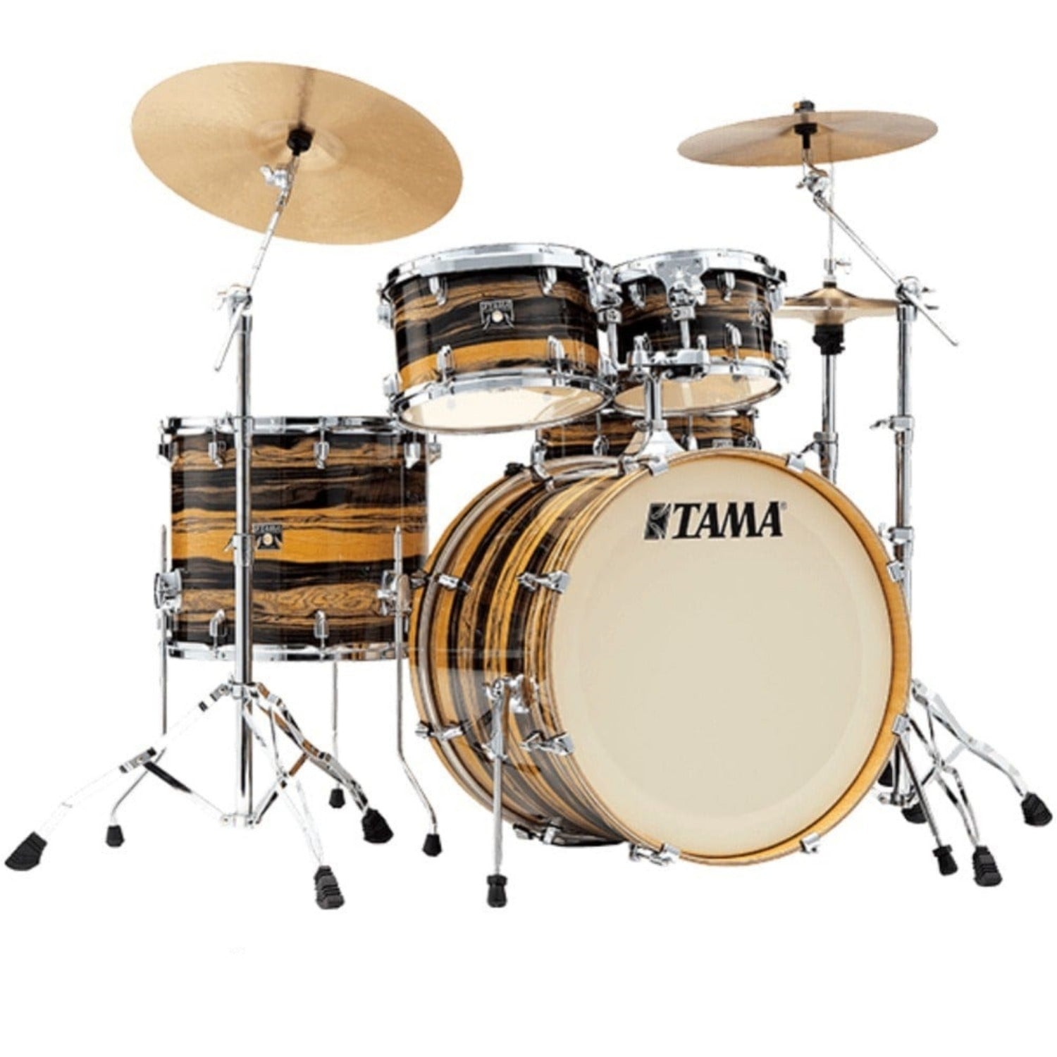 Drawing on Superstar of the past, its classic TAMA T-shape badge and streamlined low-mass single lugs point to the simpler state of art of the 70's, while the ingenious Star-Mount system and new thinner gauge 100% maple shells eclipse anything in its class. Visually ravishing, the Gloss Lacebark Pine exterior ply possesses a complex wood grain pattern to give this kit an extraordinary visual appearance.