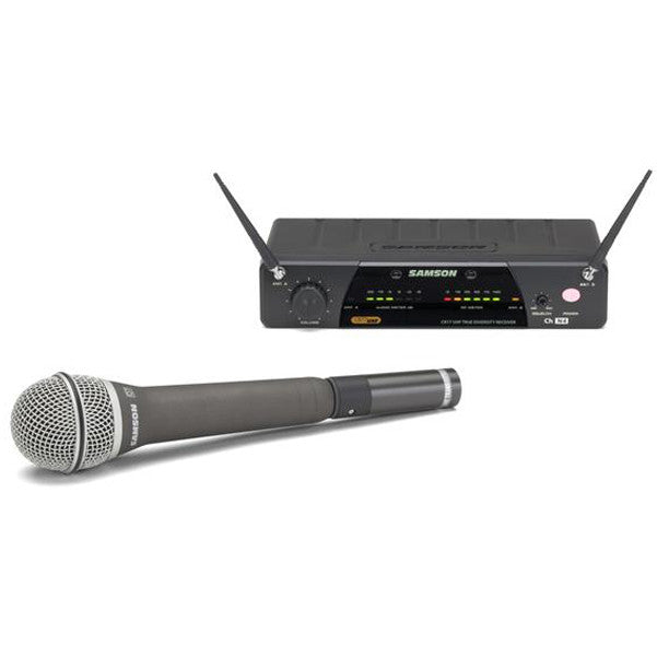 With AirLine 77 Handheld System, you get complete wireless freedom that's good to go anywhere the music takes you Samson Airline 77 + Q7 Mic Features: AX1 transmitter plugs into any standard dynamic mic to make it wireless Transmitter features power switch, power/battery LED and input level control Single AAA battery operation allows up to 14 hours of life for AX1 Includes Samson Q7 dynamic microphone True diversity UHF wireless handheld system with PLL frequency control CR77 receiver features multi-segment audio level and RF level LED meters Squelch and volume control XLR and unbalanced 1/4-inch outputs with mic/line level output switch AC adapter and 1/4-inch to 1/4-inch cable included Made in China.