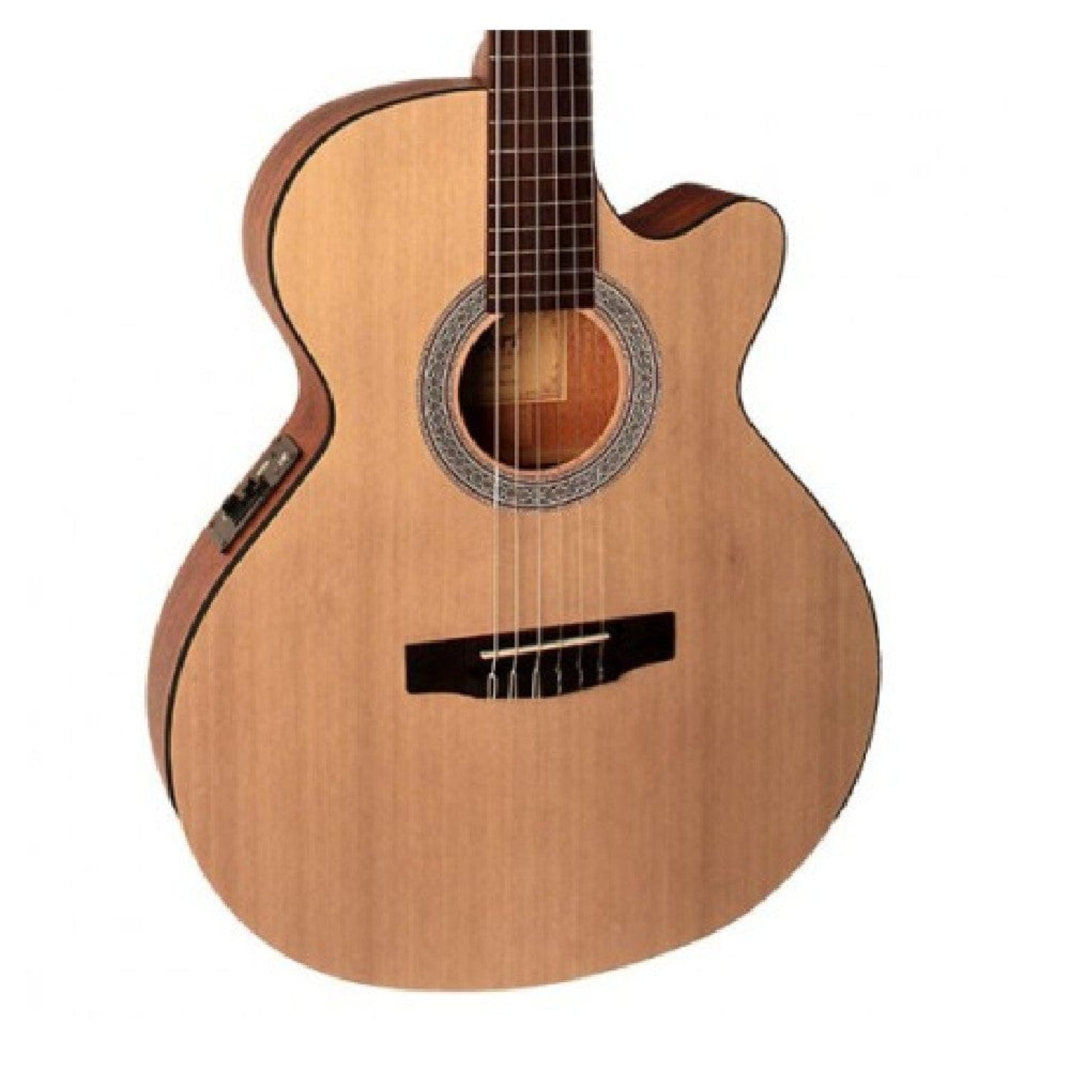 Cort CEC1 Electro-Acoustic Classical Guitar Overview: The Classic Series features two distinctive types of models: the traditional Spanish-style nylon-string AC models and hybrid nylon-string CEC models that borrow from steel-string cutaway acoustic-electrics with cutaways, narrower nut width, and Fishman electronics The traditional style AC models have been re-engineered to improve resonance for an authentic classical guitar sound while the CEC models feature slim body with cutaway, 45mm nut width and electronics for steel-string players who love the nylon-string sound.