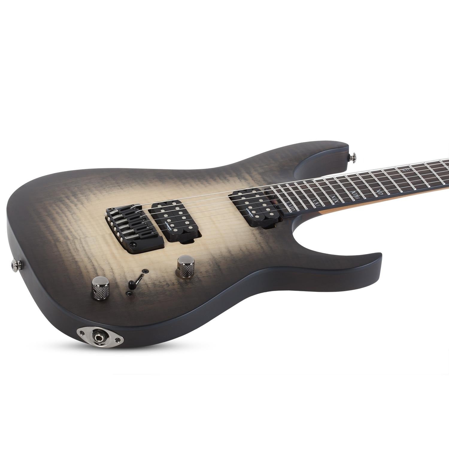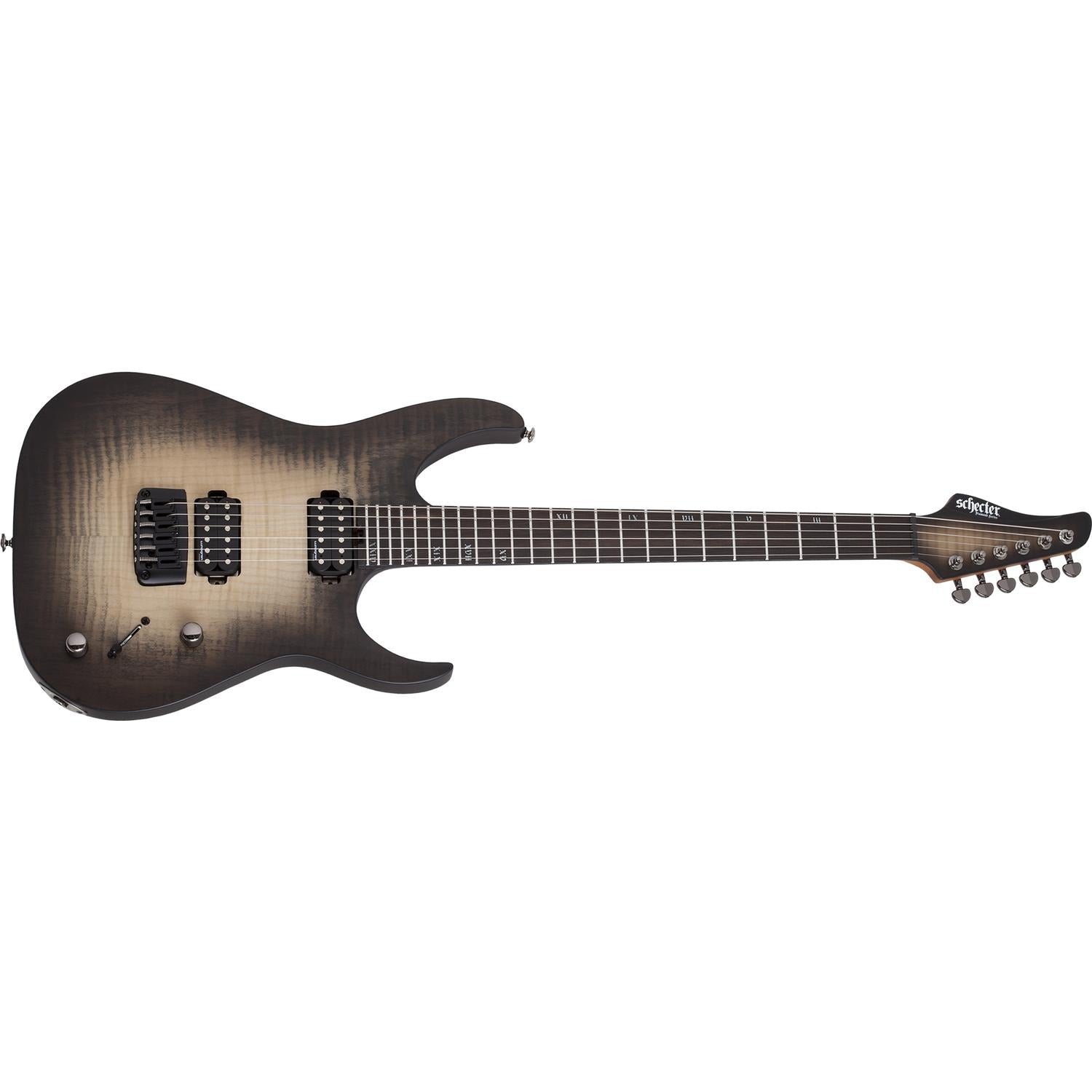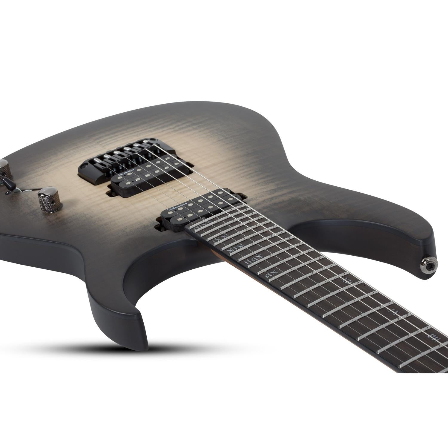 Schecter Banshee Mach 6 Electric Guitar Overview: Neck Tuners: Schecter Locking Fretboard: Ebony Neck Material: Roasted Maple/Purpleheart Multi-ply with Carbon Fiber Reinforcement Rods Inlays: Offset/Reverse Roman Numerals Side Dot Markers: Luminlay Glow in the Dark Scale: 25.5” (648mm) Neck Shape: Ultra Thin ‘U’ Thickness: @ 1st Fret- .748” (19mm)/ @ 12th Fret- .787” (20mm) Frets: 24 X-Jumbo Stainless Steel Fretboard Radius: 12”-16” Compound Radius Nut: Ernie Ball Compensated Nut Nut Width: 1.653” (42mm) Truss Rod: 2-Way Adjustable Rod w/ Heel Access Spoke Wheel Body Guitar Colors: Ember Burst (EB) Hardware Color: Black Chrome Top Contour: Radius Top Dexterity: Right Handed Construction: Neck-Thru w/Ultra Access Body Material: Swamp Ash Top Material: Flamed Maple Binding: Black 1-ply Bridge: Hipshot Ibby HM Guitar Bridge Electronics Controls: Volume/Tone (Push-Pull)/3-Way Switch Bridge Pickup: Lundgren M6 Neck Pickup: Lundgren M6 General Country of Origin: South Korea.