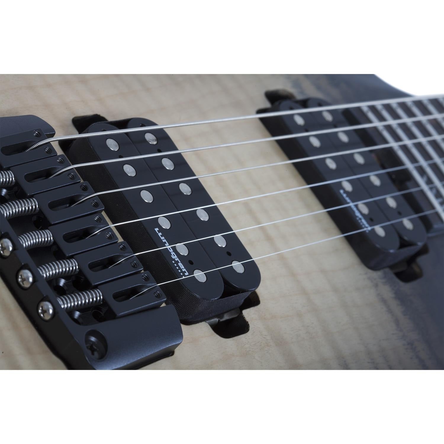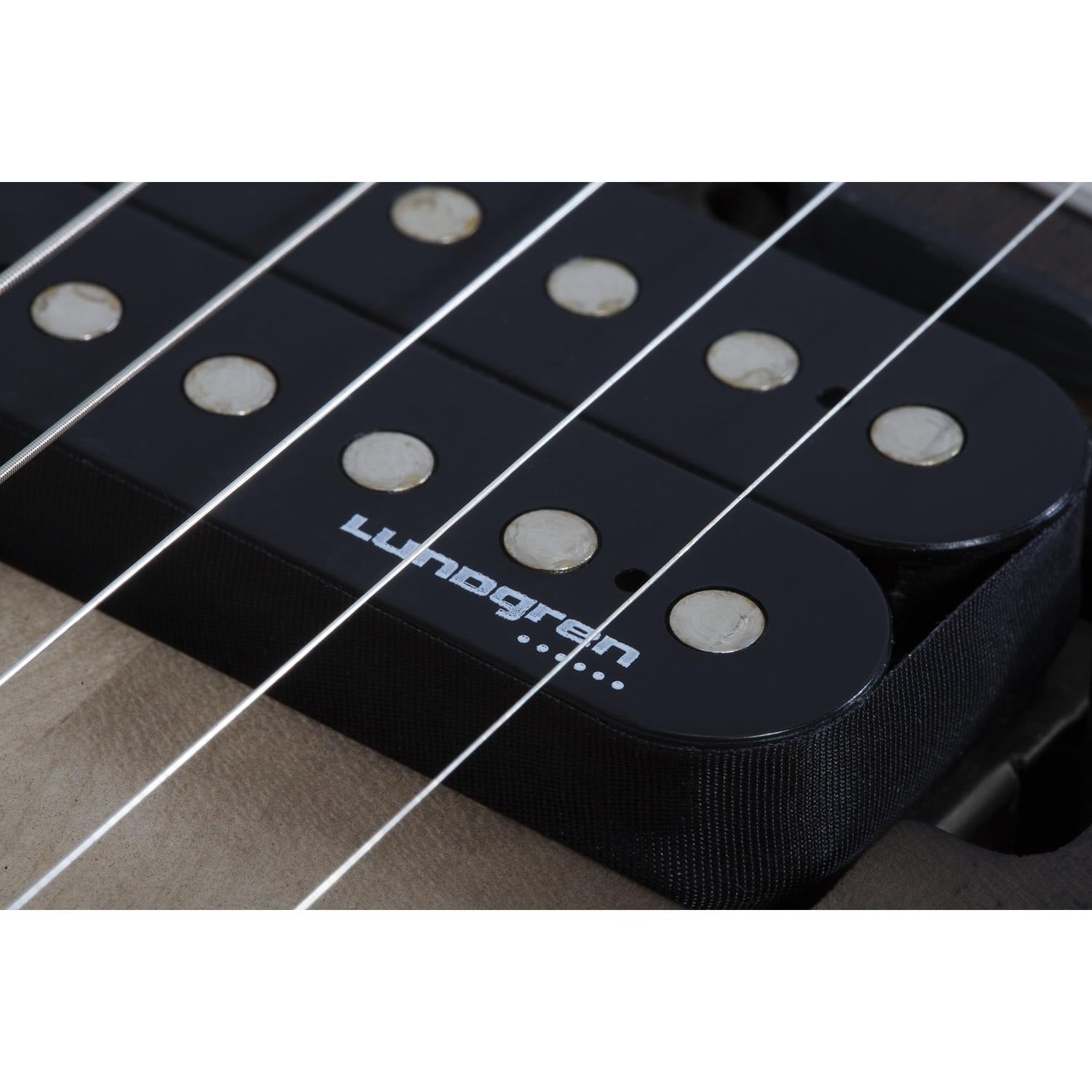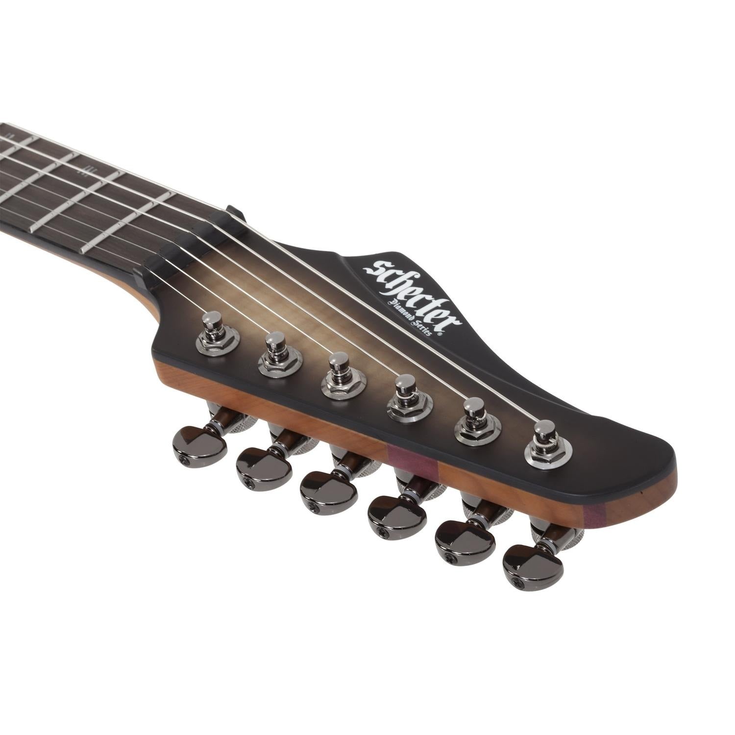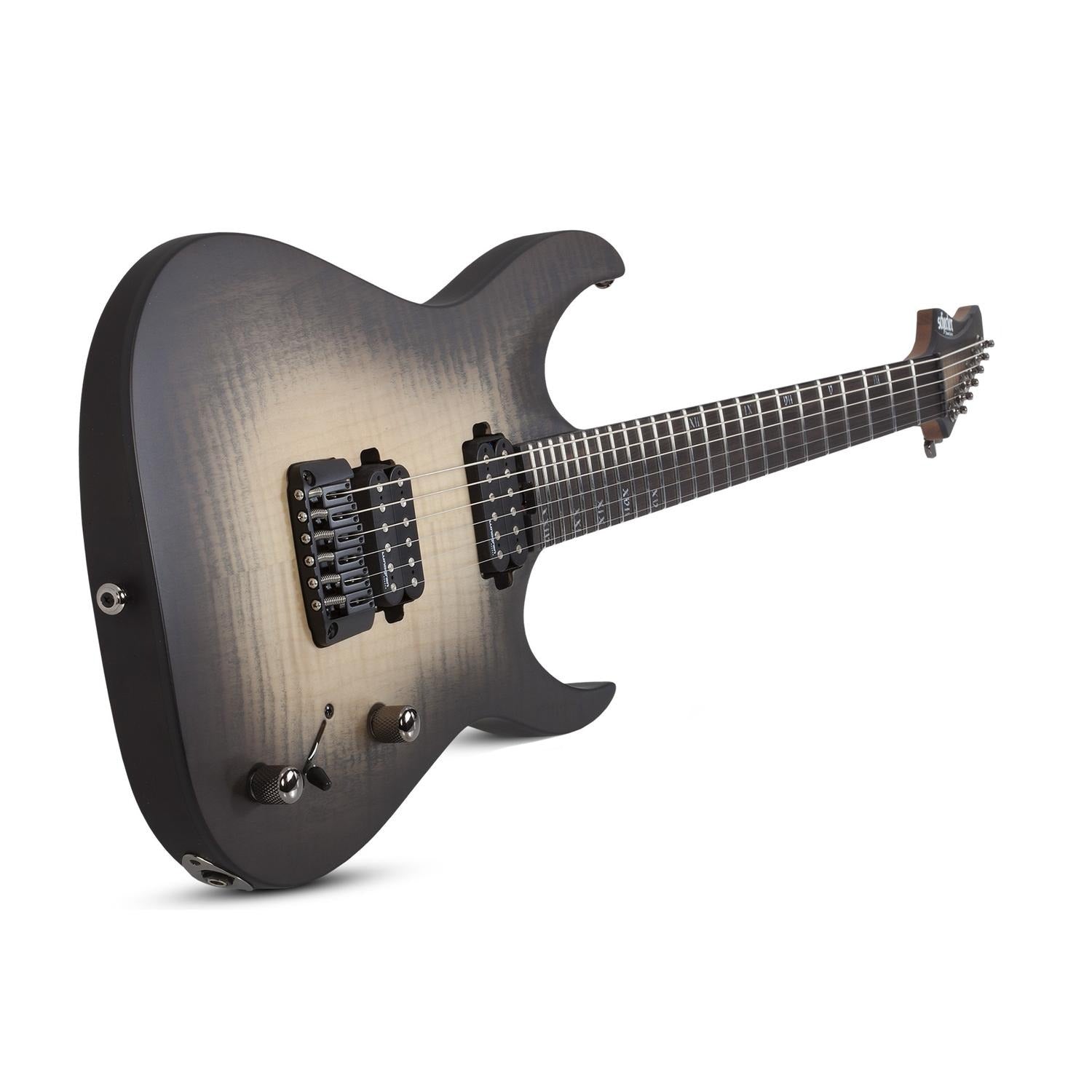 Schecter Banshee Mach 6 Electric Guitar Overview: Neck Tuners: Schecter Locking Fretboard: Ebony Neck Material: Roasted Maple/Purpleheart Multi-ply with Carbon Fiber Reinforcement Rods Inlays: Offset/Reverse Roman Numerals Side Dot Markers: Luminlay Glow in the Dark Scale: 25.5” (648mm) Neck Shape: Ultra Thin ‘U’ Thickness: @ 1st Fret- .748” (19mm)/ @ 12th Fret- .787” (20mm) Frets: 24 X-Jumbo Stainless Steel Fretboard Radius: 12”-16” Compound Radius Nut: Ernie Ball Compensated Nut Nut Width: 1.653” (42mm) Truss Rod: 2-Way Adjustable Rod w/ Heel Access Spoke Wheel Body Guitar Colors: Ember Burst (EB) Hardware Color: Black Chrome Top Contour: Radius Top Dexterity: Right Handed Construction: Neck-Thru w/Ultra Access Body Material: Swamp Ash Top Material: Flamed Maple Binding: Black 1-ply Bridge: Hipshot Ibby HM Guitar Bridge Electronics Controls: Volume/Tone (Push-Pull)/3-Way Switch Bridge Pickup: Lundgren M6 Neck Pickup: Lundgren M6 General Country of Origin: South Korea.