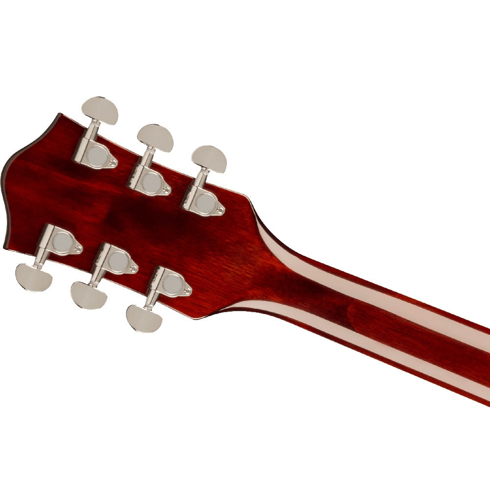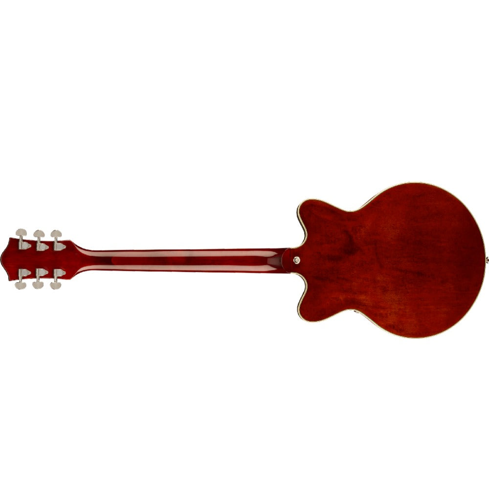 Features: All-new Broad'Tron BT-3S humbucking pickups Smaller double-cutaway arched maple body with chambered center block Soft "C" shaped Nato neck 12"-radius laurel fingerboard with pearloid Neo Classic thumbnail inlays and 22 medium jumbo frets Real bone nut Master volume, master tone and individual pickup volume controls provide complete tone-shaping flexibility Push/Pull coil-splitting on Master Volume Radio control knobs Anchored Adjusto-Matic bridge Bigsby B50 vibrato tailpiece 1-Ply Cream pickguard Nickel hardware HIGHLIGHTS: Maple Body with New Center Block Design The G2655T Center Block Jr.