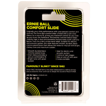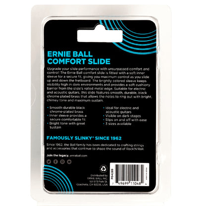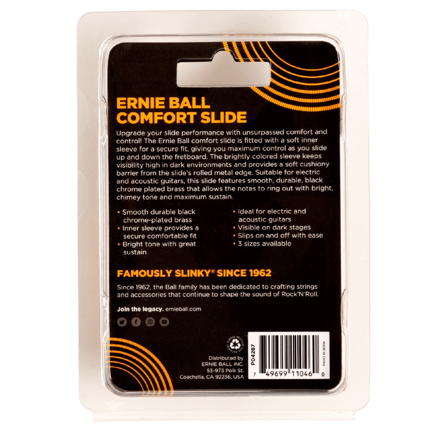 Ernie Ball Comfort Slide - Small Overview: Upgrade your slide performance with unsurpassed comfort and control. The Ernie Ball comfort slide is fitted with a soft inner sleeve for a secure fit, giving you maximum control as you slide up and down the fretboard. The brightly colored sleeve keeps visibility high in dark environments and provides a soft cushiony barrier from the slides’ rolled metal edge.