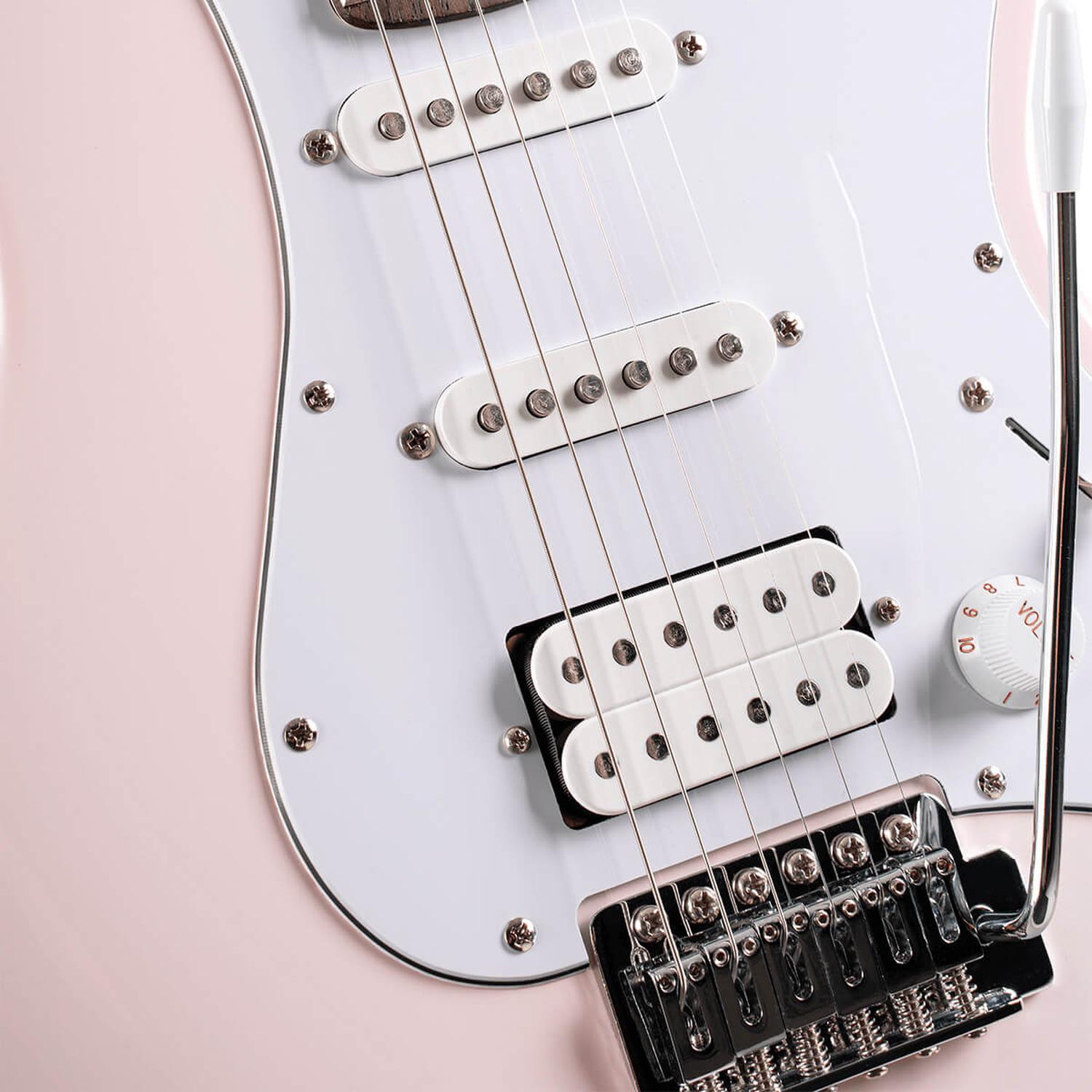 Cort G200 Features: Model Name: G200 Construction: Bolt-on Cutaway: Double Cutaway Body: Basswood Neck: Canadian Hard Maple, 1F : 21mm, 12F : 23mm Binding: N/A Fretboard: Rosewood, 12" Radius(305mm) Frets: 22 / Large (2.7mm) Scale: 25 1/2" (648mm) Inlay: White Dot Tuners: Die cast Bridge: 6-screw Vintage Tremolo Pickups: Powersound PSEG5P-5F & PSEG5P-5M & PSEG5P-5R (S-S-S) Electronics: 1 volume, 1 tone, 5way lever Hardware: CR (Chrome) Strings: D'addario EXL120(042-009) This product includes Beginner's Guide to Learning Guitar E-book Made in Indonesia