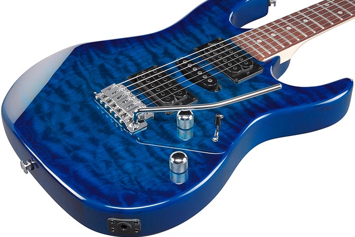Ibanez GRX70QA Specifications: Neck type : GRX Maple neck Body : Quilted Maple Art Grain top/Poplar body Fretboard : Jatoba fretboard w/White dot inlay Fret : Medium frets Bridge : FAT-6 tremolo bridge Neck pickup : Infinity R (H) neck pickup (Passive/Ceramic) Middle pickup : Infinity RS (S) middle pickup (Passive/Ceramic) Bridge pickup : Infinity R (H) bridge pickup (Passive/Ceramic) Factory tuning : 1E, 2B, 3G, 4D, 5A, 6E String gauge : .009/.011/.016/.024/.032/.042 Hardware color: Chrome Neck Dimensions: Scale : 648mm/25.5" a : Width 42mm at NUT b : Width 56mm at 22F c : Thickness 19.5mm at 1F d : Thickness 21.5mm at 12F Radius : 400mmR This product includes Beginner's Guide to Learning Guitar E-book