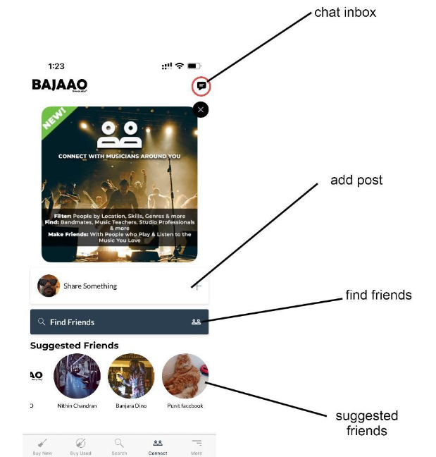 Once your profile is complete, you'll be taken to the Connect screen. Here, you can post pictures and videos, view suggested friends, find friends, and check your chat inbox or Bajaao message inbox.