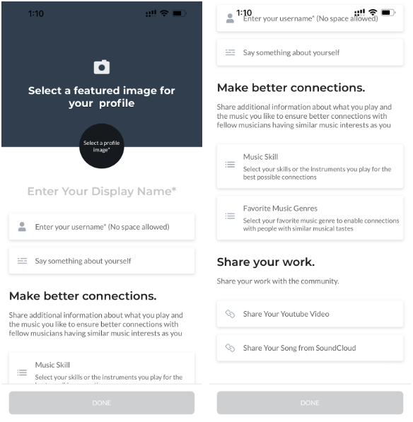 To get the most out of Bajaao Connect, make sure to complete your profile information. This includes your profile picture, username, display name, bio, musical skills, favorite genres, videos, SoundCloud clips, etc.