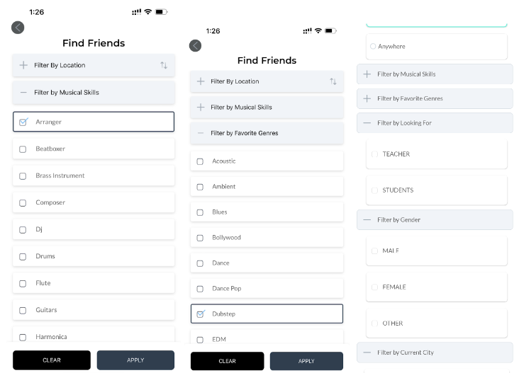 You can find other musicians on Bajaao Connect by using the location, gender, musical skills, and favorite genre filters. Simply apply the filters and view the results to find like-minded musicians.