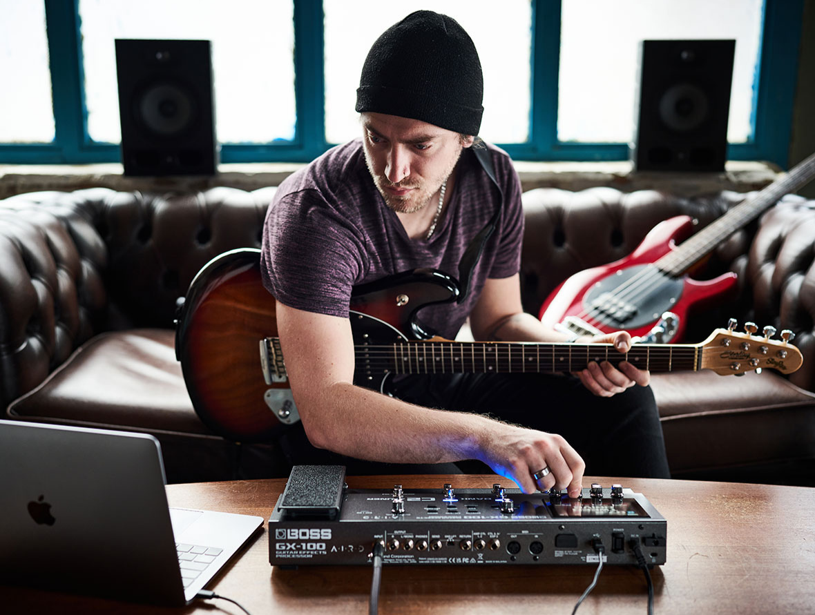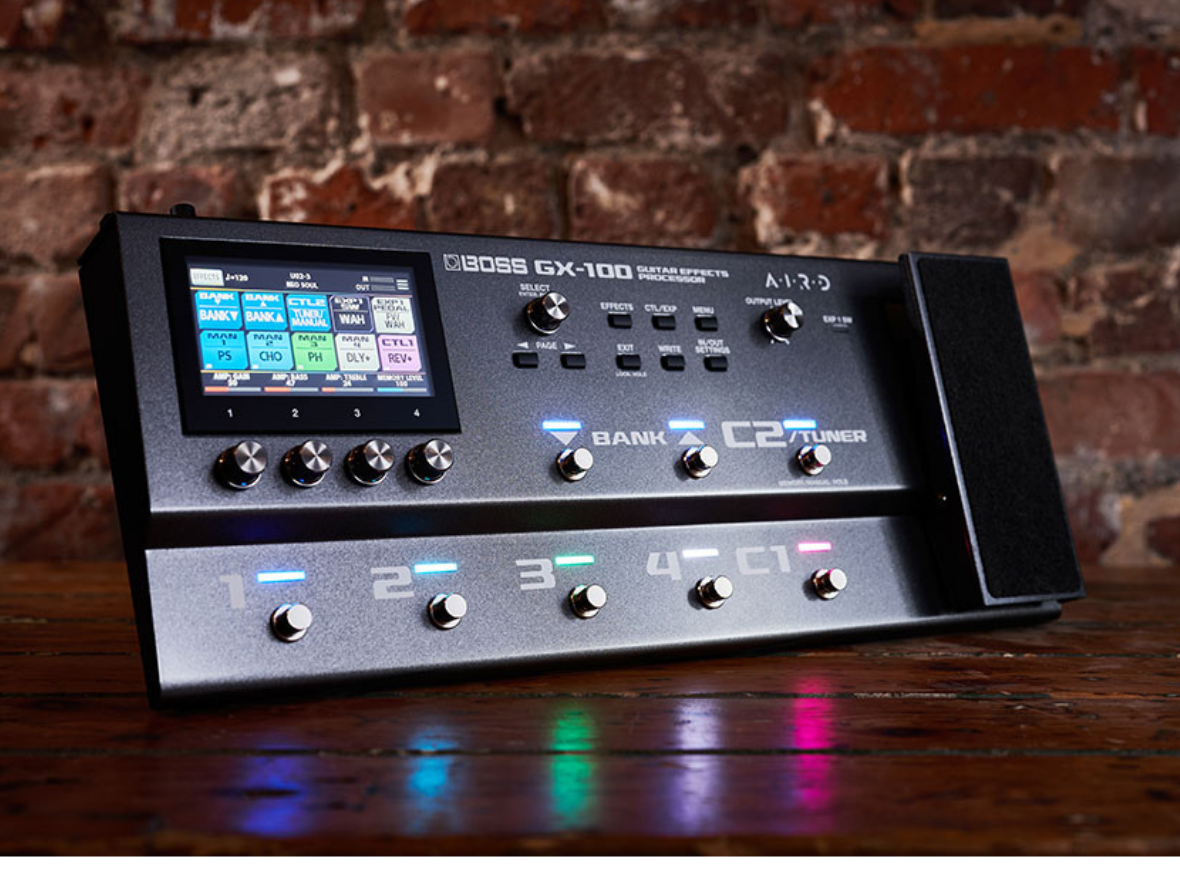 Boss GX-100 Guitar Effects Processor Overview: Color Your Music with Inspiring Tone Fusing advanced BOSS tone technologies into a sleek, ultra-modern hardware design, the inspiring GX-100 delivers top-level performance everywhere you play. Explore 23 AIRD amplifiers and over 150 effects derived from the flagship GT-1000, and craft great sounds in seconds with the intuitive color touch display.