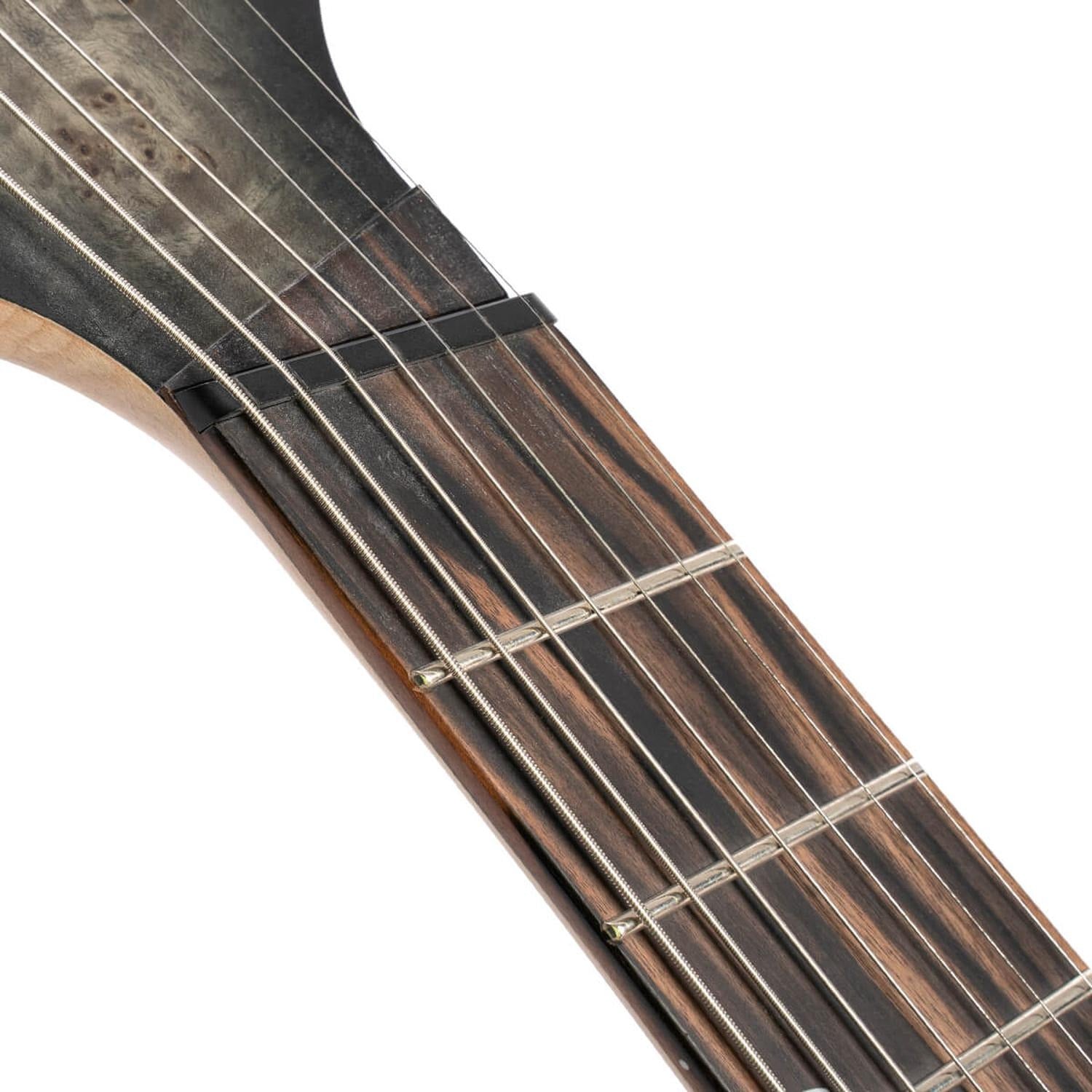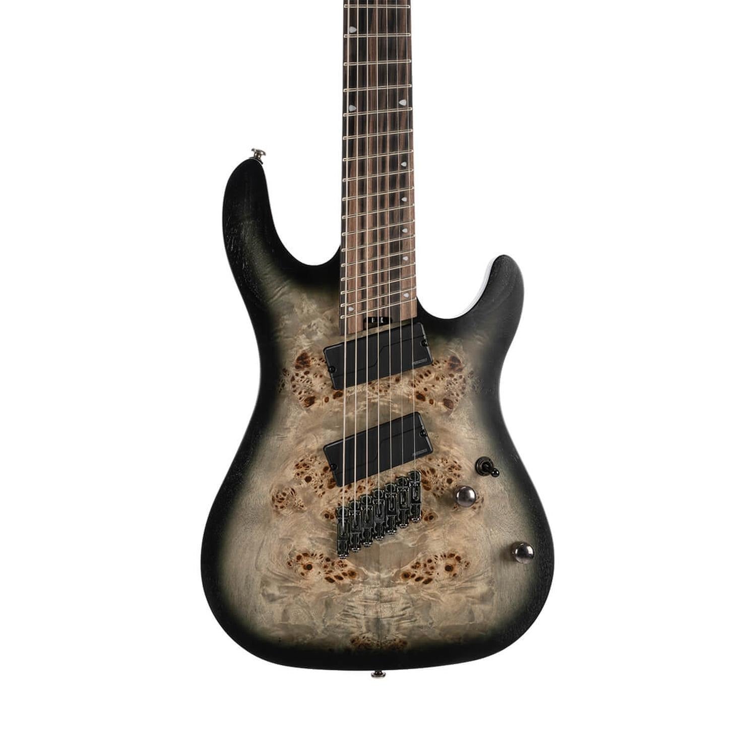 Specifications Construction: Bolt-On Body: Mahogany Top: Poplar Burl Neck: 5pcs Maple & Purple Heart Fretboard: Macassar Ebony Radius: 15.75"(400?) Frets: 24 Scale: 25.5"-27" Multi-Scale Tuners: Cort Staggered Locking Bridge: Individual Bridge w/ String Thru Body Pickups: Fishman Fluence Modern Humbucker Set Electronics: 1 Volume(P/P) 1 Tone(P/P) 3 Way Switch Hardware: Black Nickel.