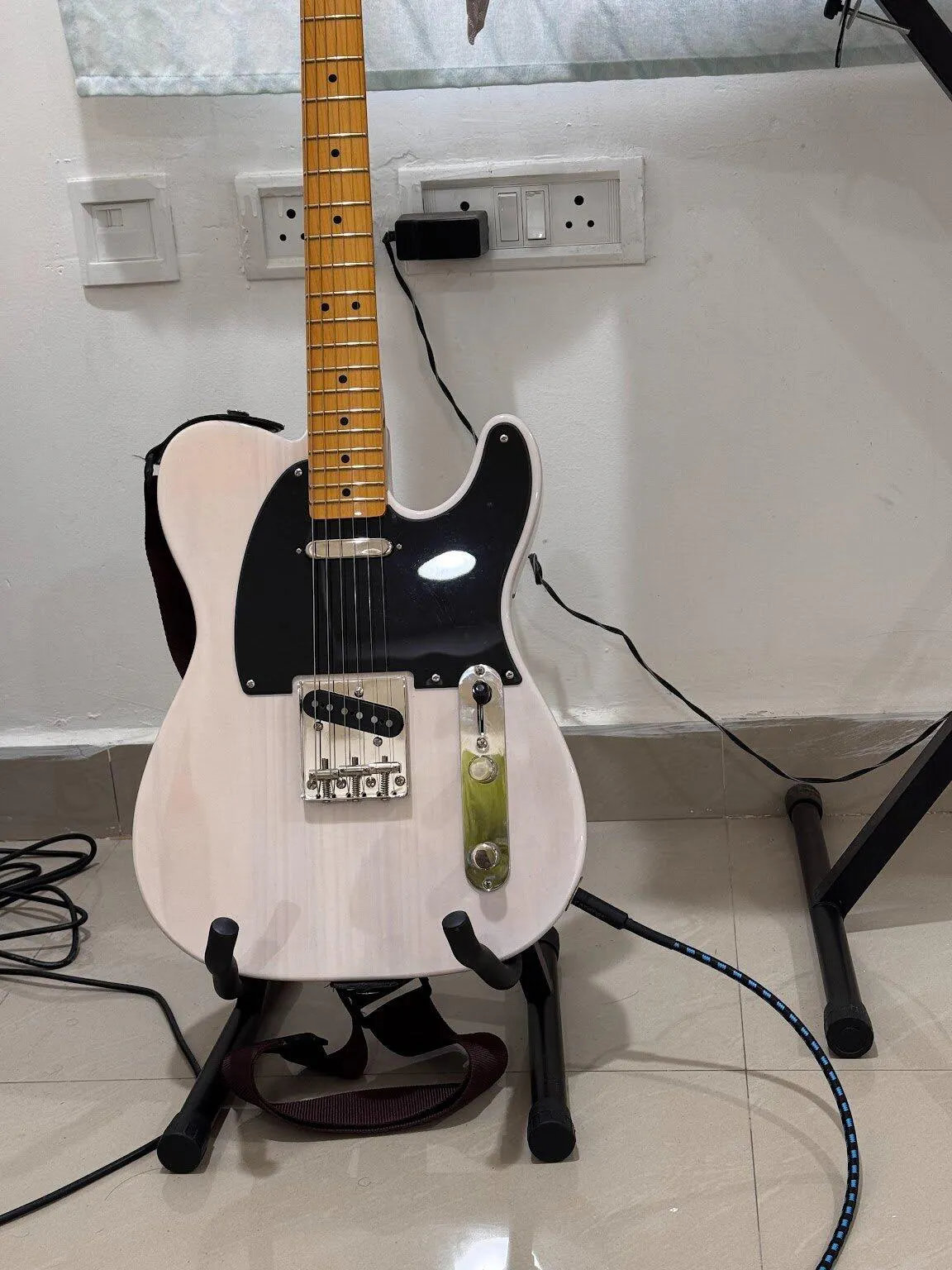 VINTAGE-TINT GLOSS NECK FINISH The neck on this model sports a vintage-tint gloss finish for a highly desirable aged look Specifications: Body Body: Pine Body Finish: Gloss Polyurethane BodY Shape: Telecaster Body Material: Pine Neck Neck Material: Maple Neck Finish: Tinted Gloss Urethane Neck Shape: "C" Shape Neck Construction: Bolt-On Fingerboard Radius: 9.5" (241 mm) Fingerboard Material: Maple Position Inlays: Black Dot Side Dots: Black Number of Frets: 21 Truss Rod: Head Adjust String Nut: Bone Nut Width: 1.650" (42 mm) Nut Material: Bone Hardware Bridge: 3-Saddle Vintage-Style Strings-Through-Body Tele® with Chrome Barrel Saddles Pickguard: 1-Ply Black Pickup Covers: Neck: Nickel; Bridge: Black Control Knobs: Knurled Flat-Top Switch Tip: Black Hardware Finish: Nickel Tuning Machines: Vintage-Style Strings: Nickel Plated Steel (.009-.042 Gauges) Neck Plate: 4-Bolt Squier Strap Buttons: Standard Electronics Bridge Pickup: Fender Designed Alnico Single-Coil Neck Pickup: Fender Designed Alnico Single-Coil Pickup Configuration: SS Controls: Master Volume, Master Tone Switching: 3-Position Blade: Position 1.