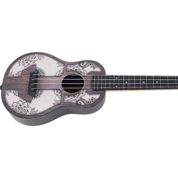 The soundboard of the Flight TUC-40 MW, which is made of laminate linden wood, features a geometric configuration of symbols similar to those found in Eastern spiritualism. The ukulele also sports an ABS body, neck, fretboard and bridge. The result is a ukulele with low action that is easy to clean and maintain. Want a ukulele that is tough, looks amazing, sounds great, plays well, and is ideal for players of any skill level? If so, check out the Flight TUC-40 MW Concert Travel Ukulele at your local Flight dealer!