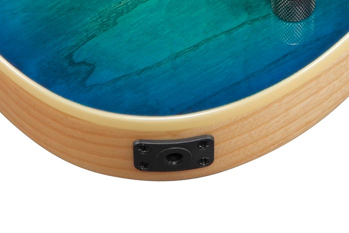 With the guitar held in the playing position, there is one knob and one switch along the lower edge of the body. Closest to the neck is the five-way pickup selector switch. Closer to the input jack is the tone knob. The volume knob is located right above the five-way pickup selector switch.