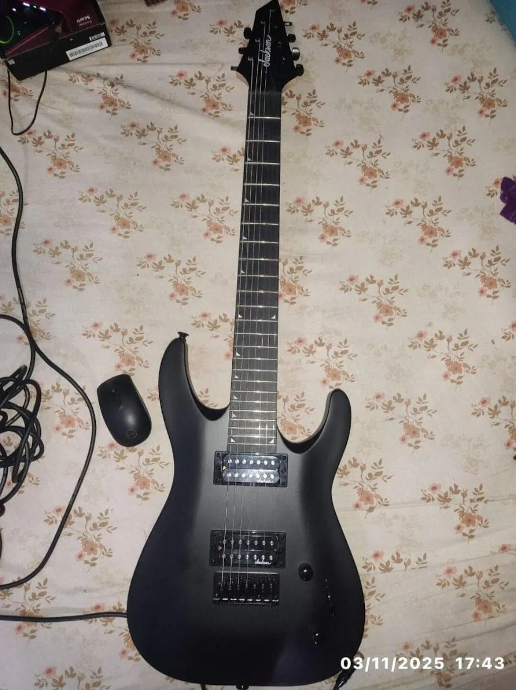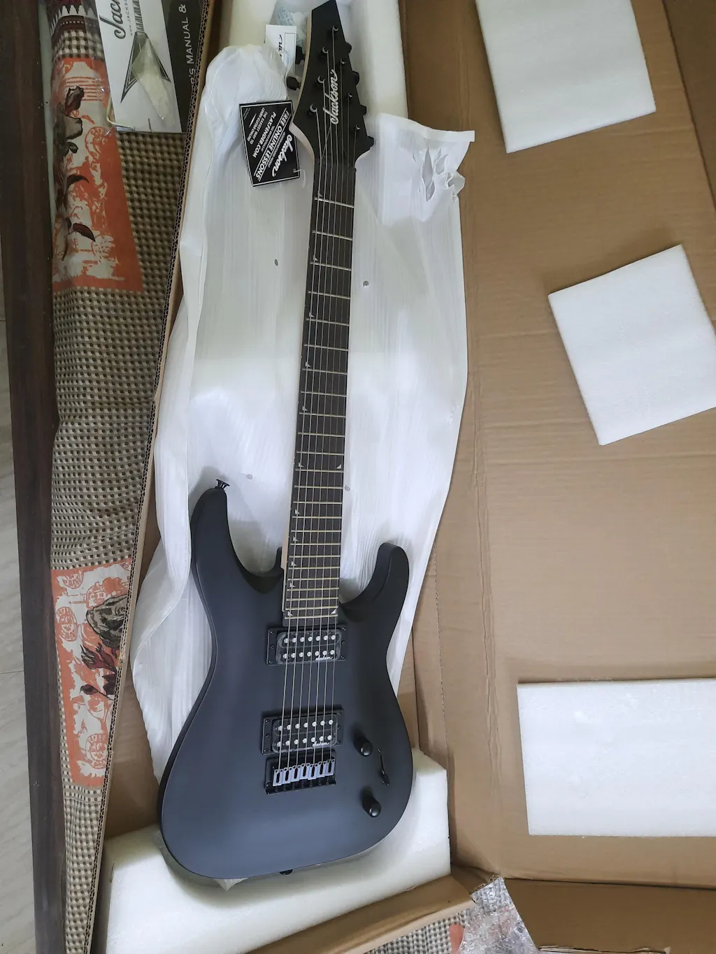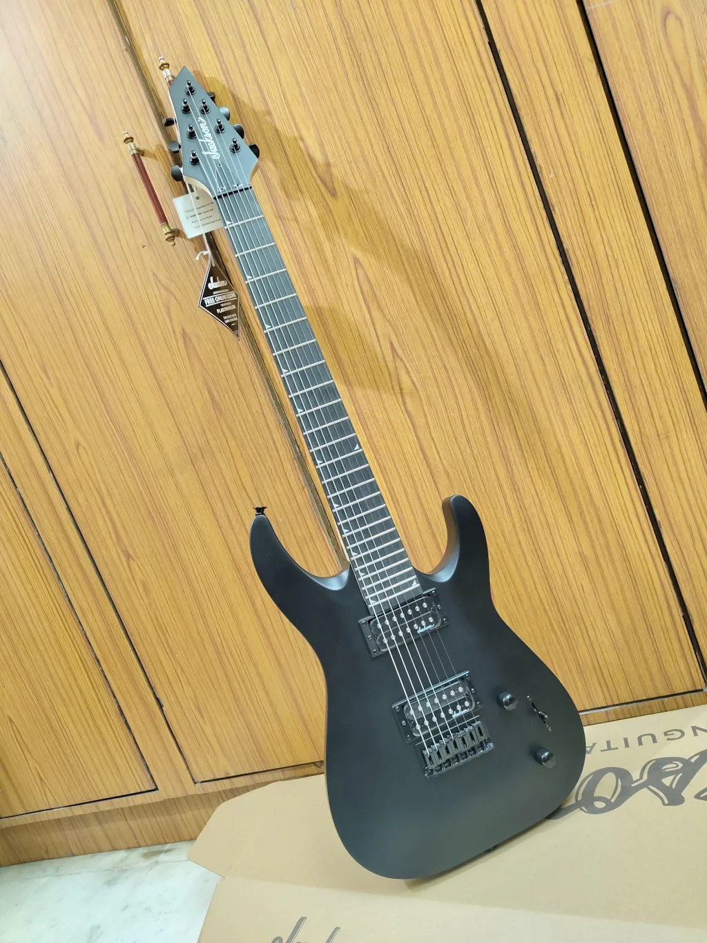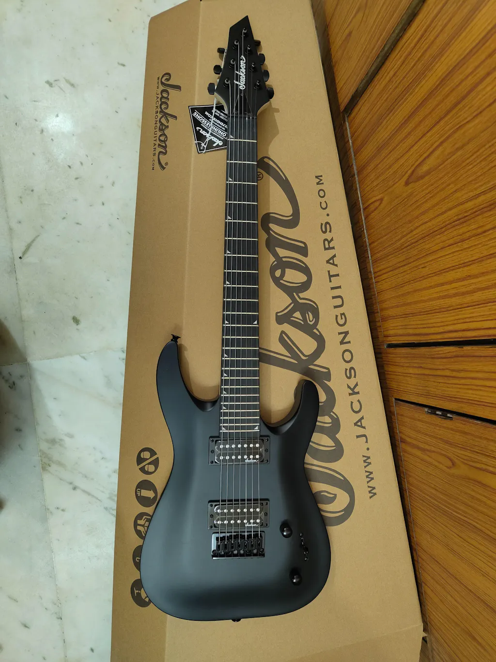 General Model Name: JS22-7 Dinky, Rosewood Fingerboard, Fixed Bridge, Satin Black Model Number: 2910131576 Series: JS Color: Satin Black Body Body Material: Basswood Body Finish: Matte Polyester Body Shape: Dinky Neck Neck Material: 1-Piece Bolt-On Maple with Graphite Reinforcement and Scarf Joint Neck Finish: Hand-Rubbed Oil Neck Shape: 3rd Fret: 0.790", 12th Fret: 0.850" Scale Length: 26.5" (673 mm) Fingerboard: Rosewood Fingerboard Radius: 16" (406.4 mm) Number of Frets: 24 Fret Size: Jumbo Nut Width: 1.875" (47.6 mm) Position Inlays: Piranha Tooth (Small Shark Fin) Headstock: Jackson AT (3-Over/4-Under) Neck Plate: Recessed Ferrules (No Neck Plate) Electronics Bridge Pickup: Jackson High Output 7 String Humbucking Neck Pickup: Jackson High Output 7-String Humbucking Controls: Master Volume, Master Tone Pickup Switching: 3-Position Blade - Position 1.