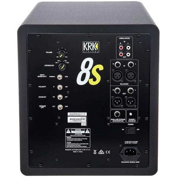 KRK 8S2 8 inch Powered Subwoofer: Features: Power: 109 W Class D amplifier Components: 8" Glass aramid fabric woofer Frequency range: 35 - 133 Hz Maximum output level: 112.8 dB Switchable crossover frequencies at 70, 80, 90 and 100 Hz Inputs and outputs: XLR, 6.3 mm jack as well as RCA Footswitch connection (footswitch not included) Switch for polarity Input sensitivity Stand-by and ground-lift Dimensions (H x W x D): 362 x 339 x 294 mm Weight: 11.8 kg Made in China.