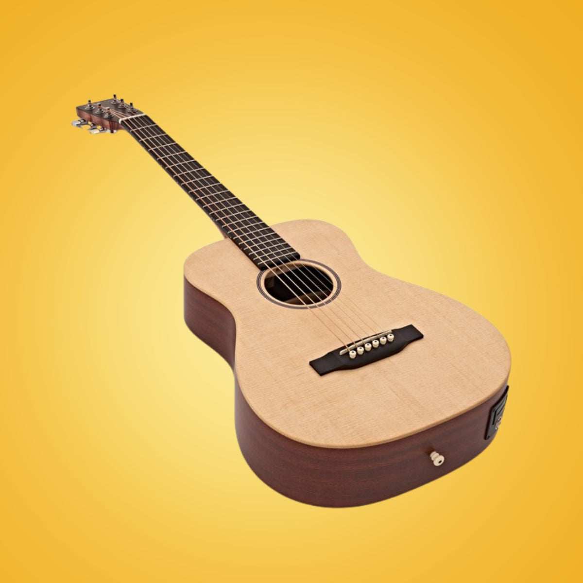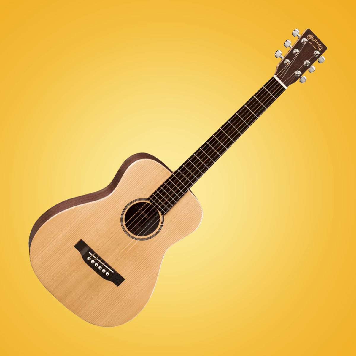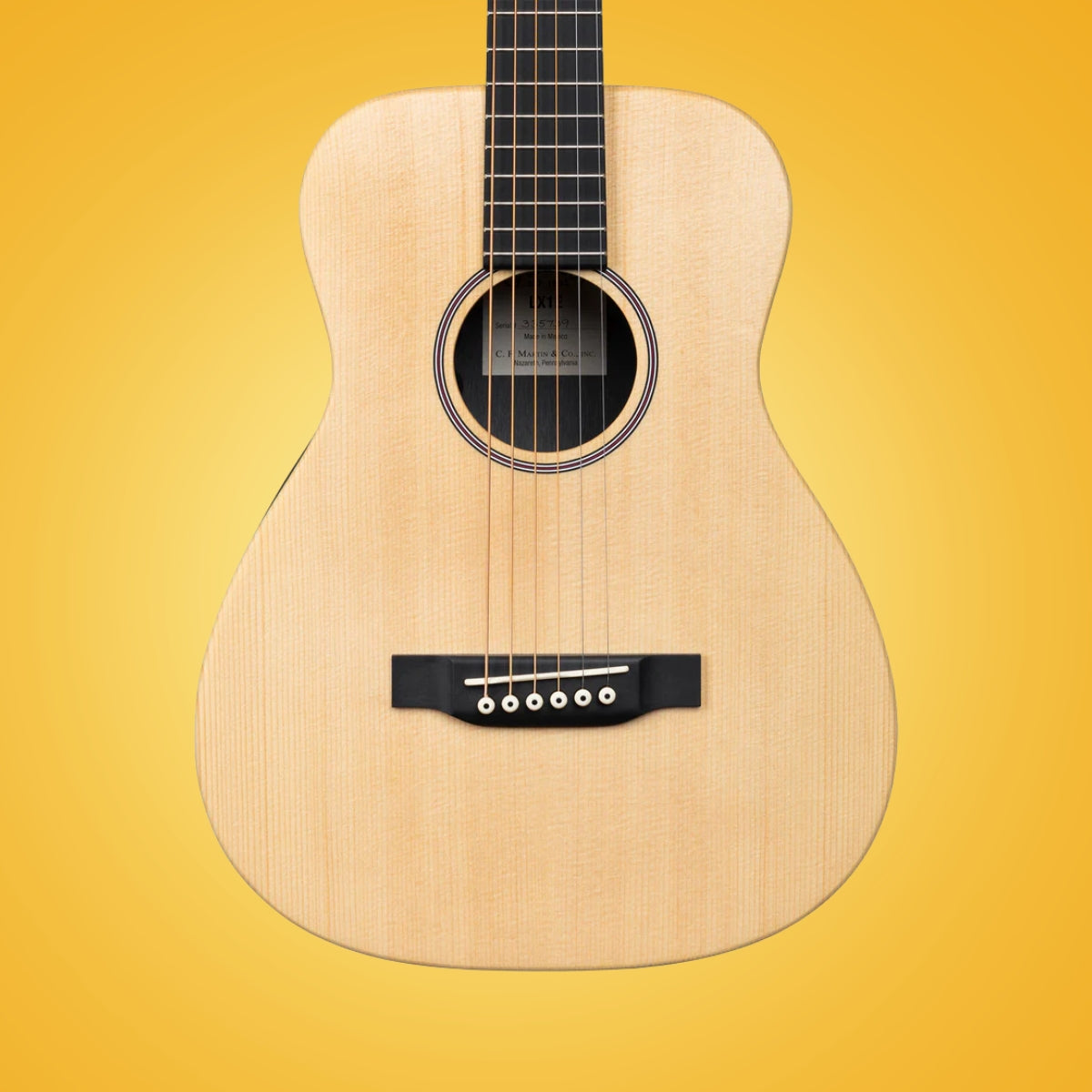 Martin LX1E Little Martin Electro Acoustic Guitar While the Little Martin is our smallest guitar, it is very big on tone, quality and versatility. The LX1E acoustic electric model features a solid Sitka spruce top, mahogany high-pressure laminate (HPL) back and sides, and a warm satin finish. It’s ideal for travel, student practice or for just playing around the house or campfire. This model includes SUSTAINABLE WOOD CERTIFIED parts.