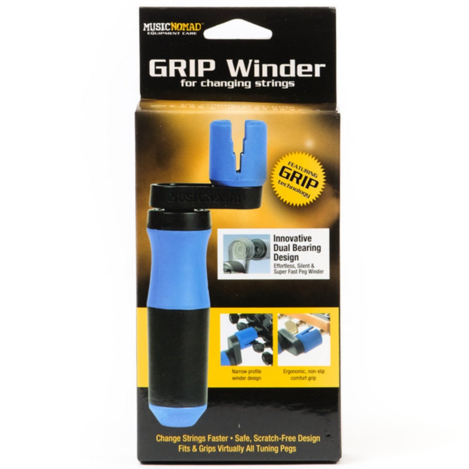 Changing strings just got a whole lot easier, safer and more FUN! MusicNomad’s patented GRIP Winder has a built in dual bearing design that makes turning the GRIP Winder handle effortless, silent and super fast. Our ergonomic and non-slip grip handle gives you total control and comfort. Our innovative GRIP technology smoothly and silently slips over your tuning pegs for a scratch free & clank free operation compared to traditional plastic peg winders. Our contoured design fits virtually all tuning pegs both big and small. Our narrow profile keeps you from hitting close fitted pegs on 12 string and electric guitars. As an added bonus we have designed a 10mm ballistic nylon hex wrench in the bottom for safely tightening the most popular size (10mm) of tuning machine bushings. It’s perfect for electric and acoustic guitar, bass, banjo, mandolin, ukulele and orchestral strings. Using the highest quality materials including a carbon steel shaft. Don’t lose it or loan it, you’ll look forward to the next time you change your strings. That’s MusicNomad quality – raising the bar in equipment care.