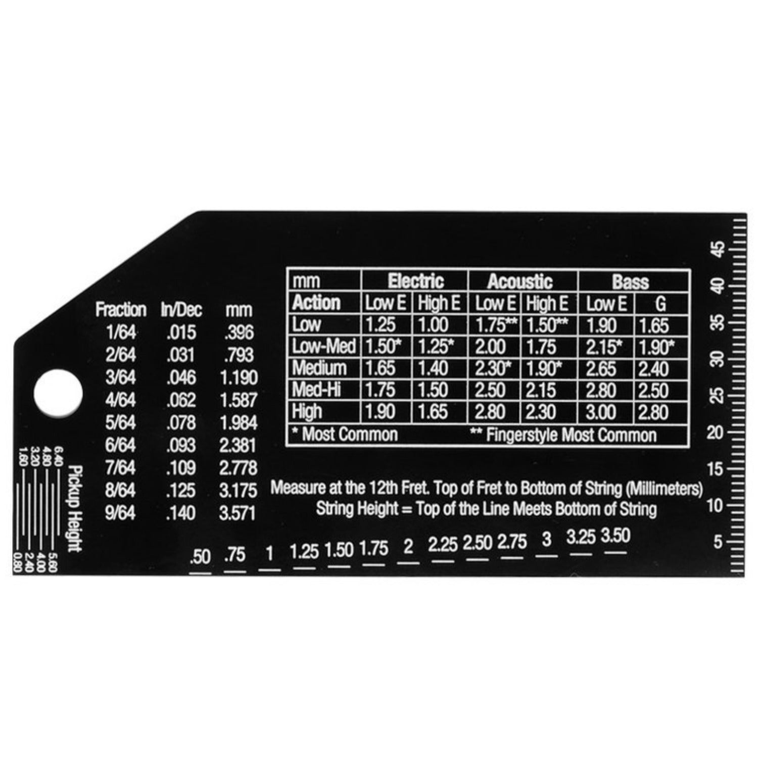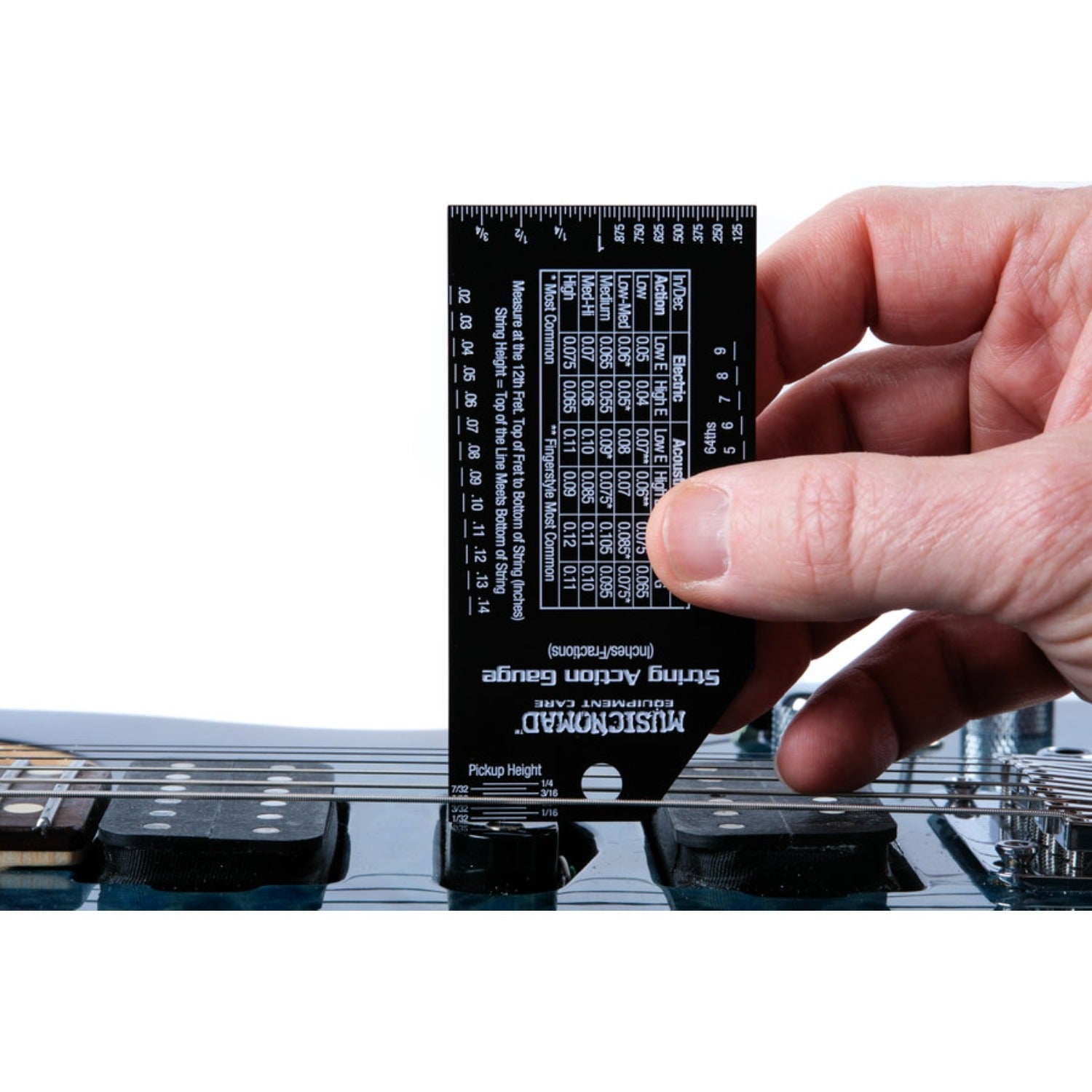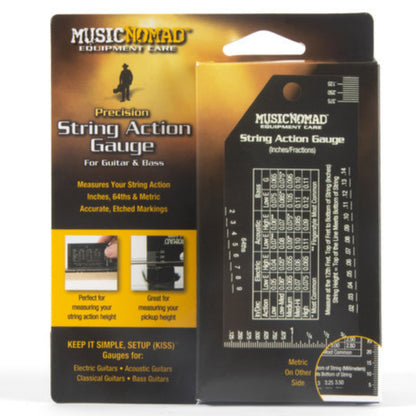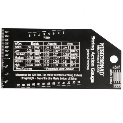 What if you could get accuracy, readability, quality & functionality in one string action gauge? Winner! Being able to measure your string action is a critical step in the setup process. MusicNomad’s patent pending precision String Action Gauge is packed with unmatched features & benefits. It starts with accurate measurements that are easy to read with the black finish contrasted with deep etched white markings. The high quality stainless steel design combined with numbers & lines that don’t rub off ensures years of use. We include measurements in inches, metric & 64ths to customize to your preference. Our convenient chart on proper height by instrument type takes out the guesswork. The pickup ruler helps you dial in your sound even more. That's MusicNomad quality – raising the bar in equipment care.