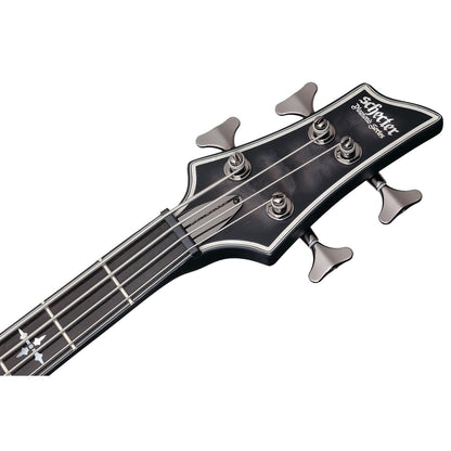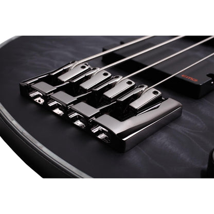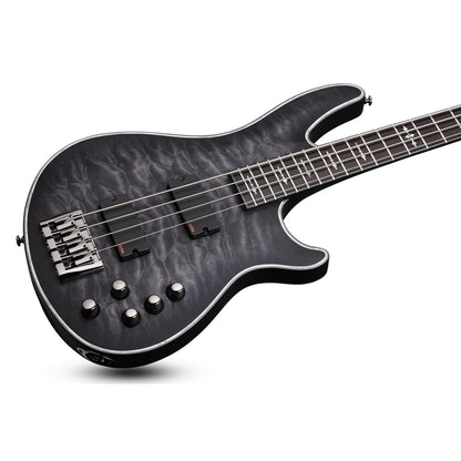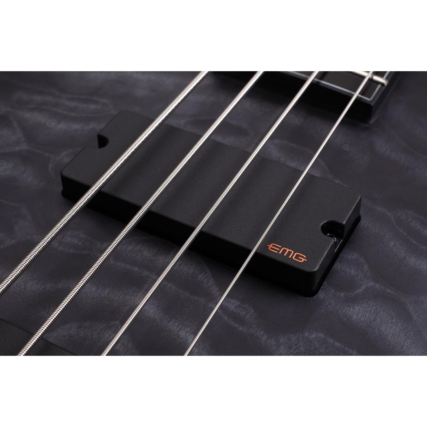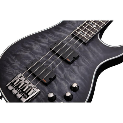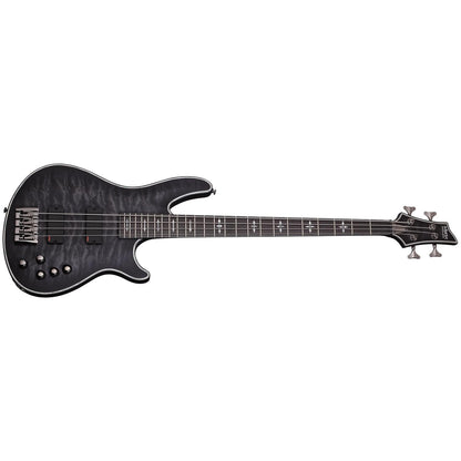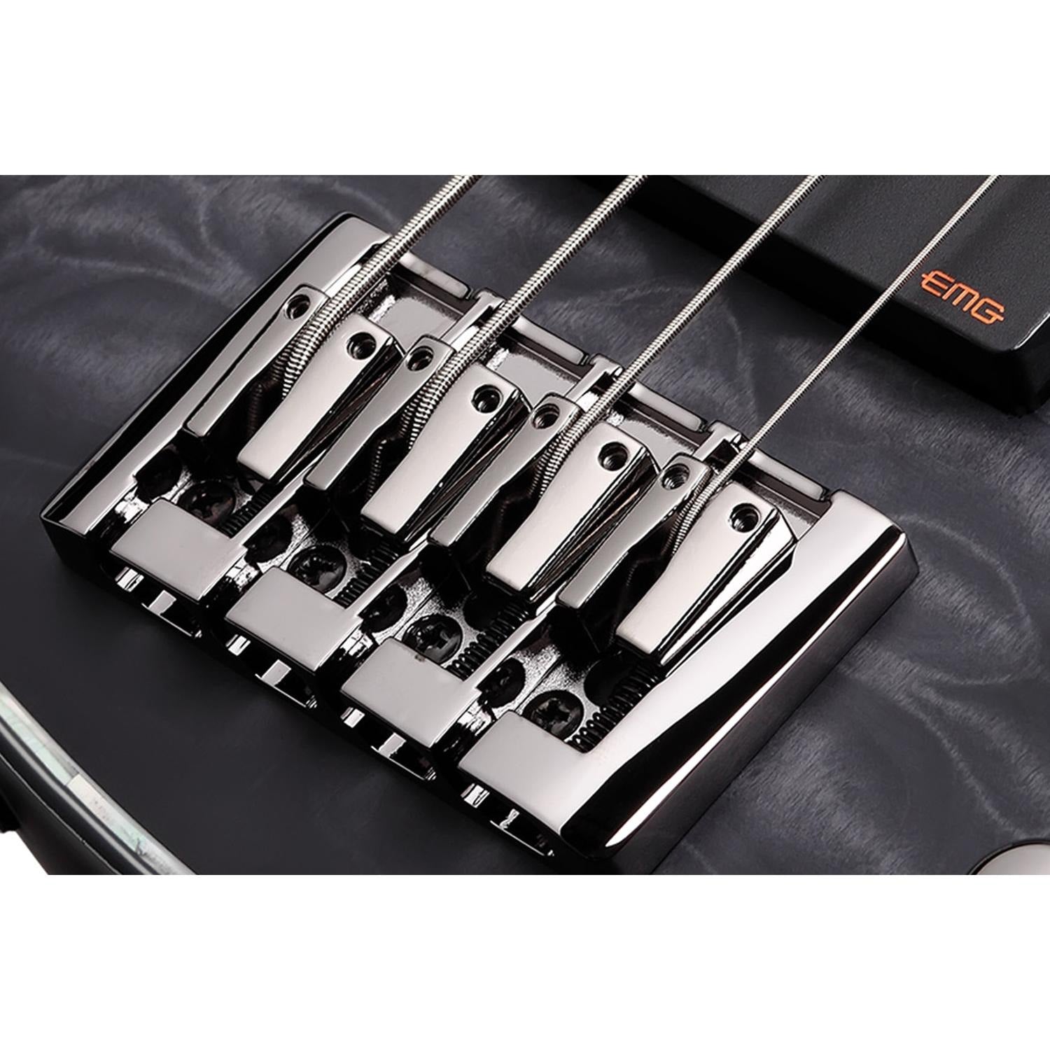 Schecter Hellraiser Extreme 4 String Bass Guitar Overview: Neck Tuners: Grover Fretboard: Ebony Neck Material: Maple/Walnut Multi-ply Inlays: MOP Gothic Crosses Scale: 34” (863mm) Neck Shape: Thin ‘C’ Thickness: @ 1st Fret- .787” (20mm)/ @ 12th Fret- .866” (22mm) Frets: 24 X-Jumbo Fretboard Radius: 16” (406mm) Nut: Graph Tech XL Black Tusq Nut Width: 1.496” (38mm) Truss Rod: 2-Way Adjustable Rod w/ 5/32” (4mm) Allen Nut Body Hardware Color: Black Chrome Top Contour: Arched Top Dexterity: Right Handed Construction: Neck-Thru w/Ultra Access Body Material: Mahogany Top Material: Quilted Maple Binding: MOP w/ BLK/WHT/BLK Multi-ply Bridge: Schecter Custom Bass String Thru (or Top Load) Electronics Controls: Volume (Push-Pull)/Volume (Push-Pull)/ Active EMG 3-Band EQ Bridge Pickup: EMG 35TW Neck Pickup: EMG 35TW General Country of Origin: South Korea.