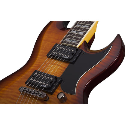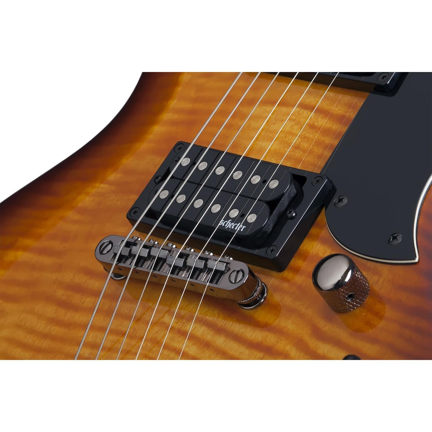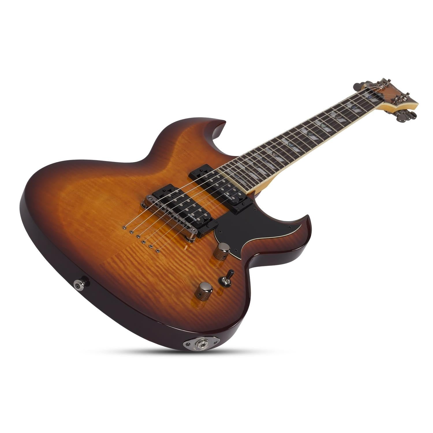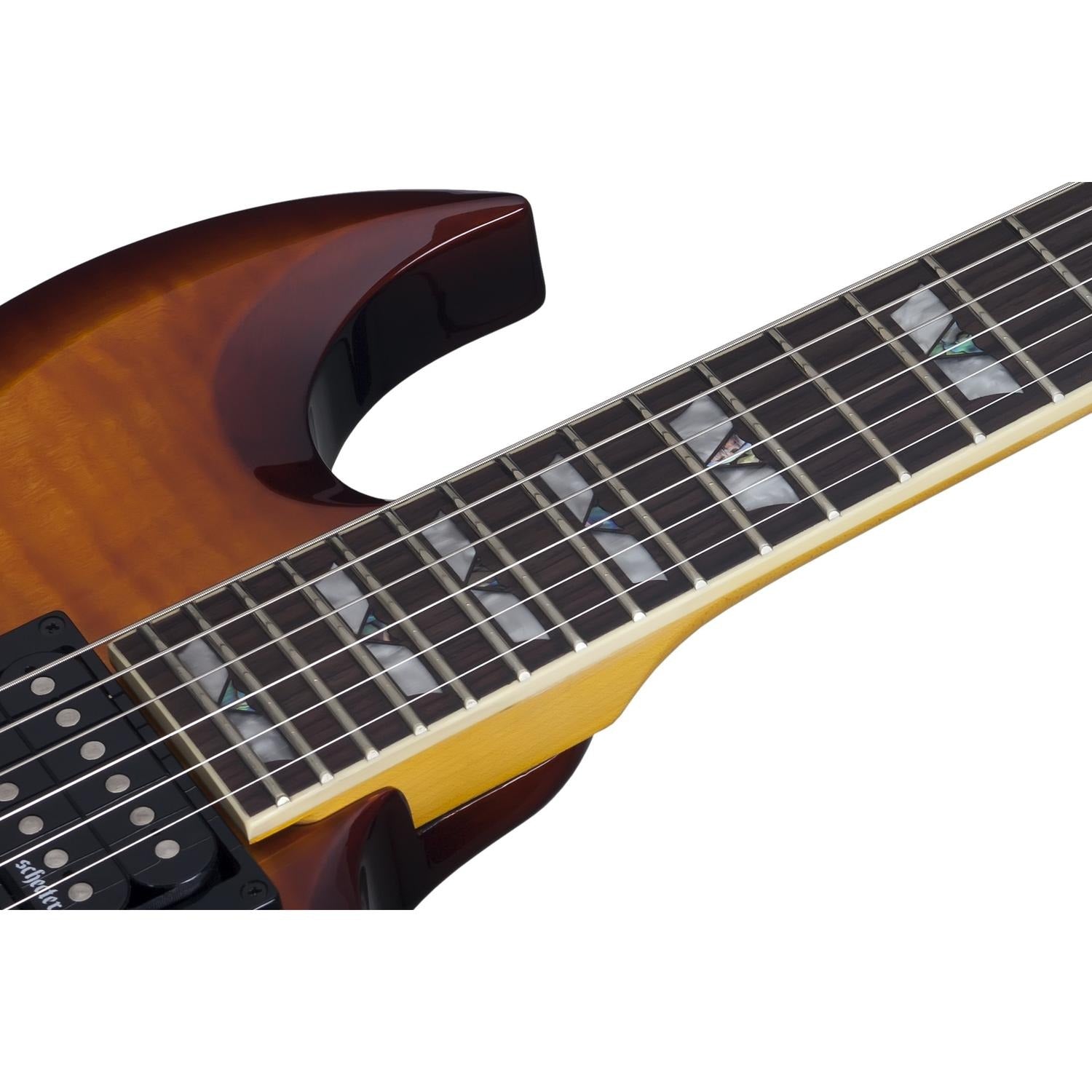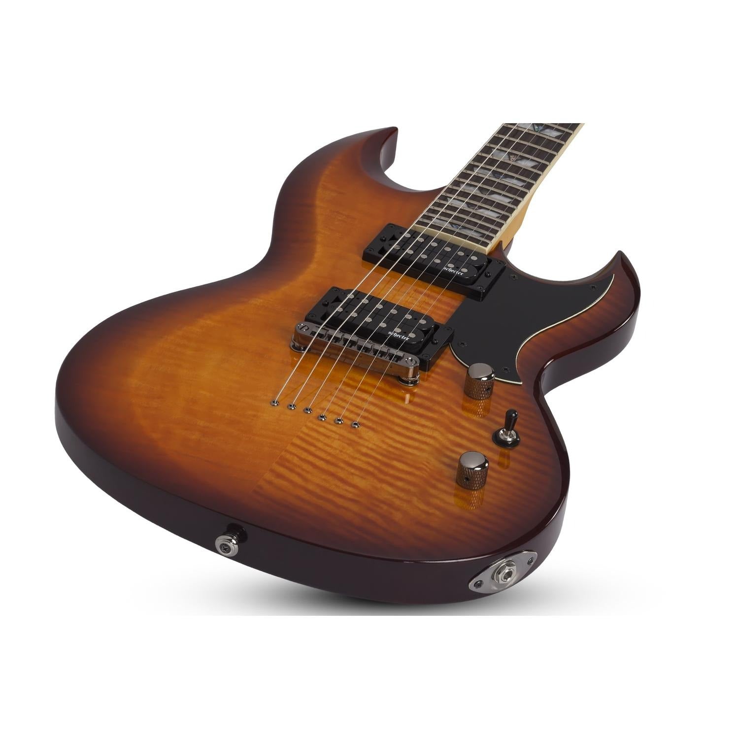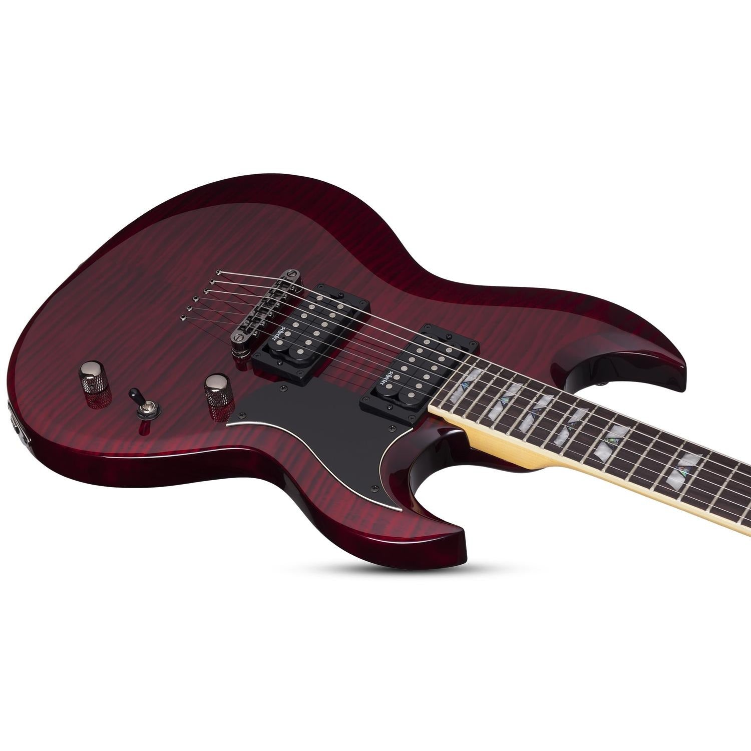 Schecter S-II Omen Extreme Solid Body 6-String Electric Guitar: Specifications: General Model Name: S-II Omen Extreme Country of Origin: Indonesia Guitar Colors: Black Cherry (BCH) and Vintage Sunburst (VSB) Neck Tuners: Schecter Fretboard: Rosewood Neck Material: Maple Inlays: Abalone & Pearloid Split Tempest Crown Scale: 24.75” (628mm) Neck Shape: Thin ‘C’ Thickness: @ 1st Fret- .787” (20mm)/ @ 12th Fret- .866” (22mm) Frets: 24 X-Jumbo Fretboard Radius: 14” (355mm) Nut: Graph Tech XL Black Tusq Nut Width: 1.653” (42mm) Truss Rod: 2-Way Adjustable Rod w/ 5/32” (4mm) Allen Nut Body Hardware Color: Black Chrome Top Contour: Flat Top w/Bevel Edge Dexterity: Right Handed Construction: Bolt-on Body Material: Mahogany Top Material: Flamed Maple Bridge: Tune-O-Matic w/ String Thru Body Electronics Controls: Volume/Tone (Push-Pull)/3-Way Switch Bridge Pickup: Schecter Diamond Plus Neck Pickup: Schecter Diamond Plus Accessories Knobs: Metal Knurled w/ Set Screw Strings: Ernie Ball Regular Slinky #2221 (.010-.046) This product includes Beginner's Guide to Learning Guitar E-book.