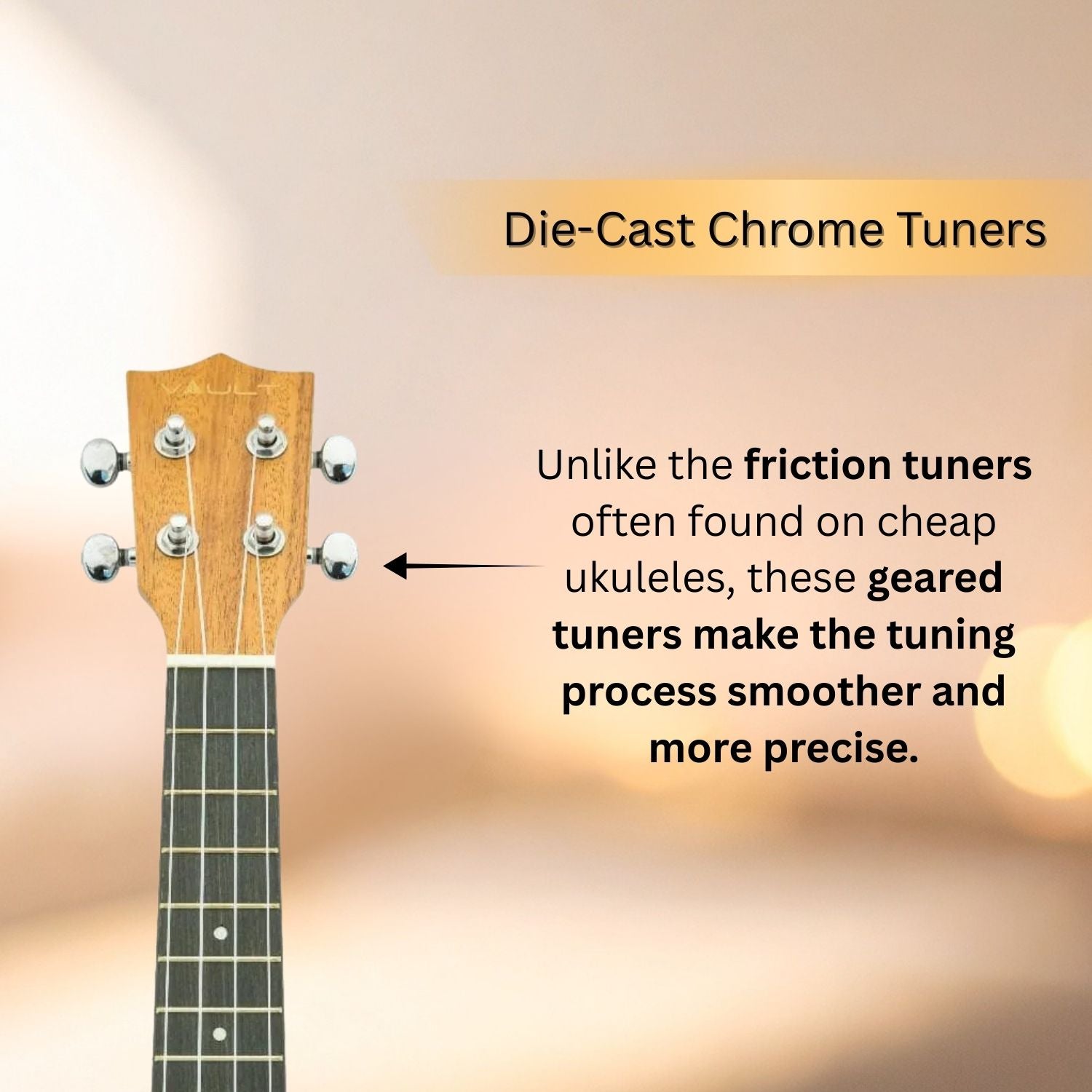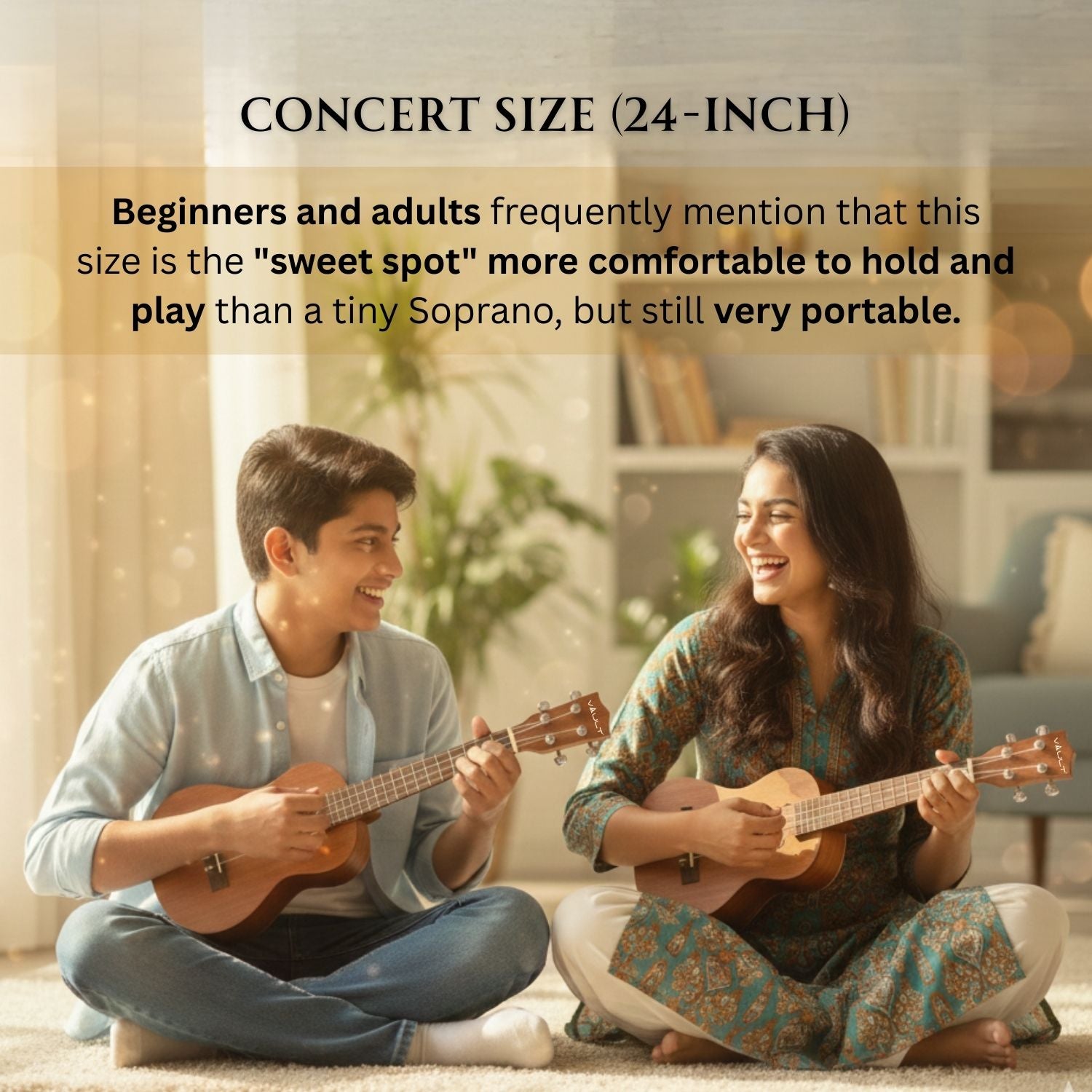 Vault UK-100 is a 24 inch Concert Ukulele With Gig Bag. It has a sturdy construction and is portable and easy to use outdoors. Mahogany Laminate Neck, Sapele Back and Sides with a Techwood Fretboard create rich, clean and warm tones. Add the high quality strings and you get the Vault UK-100 Concert Ukulele, which is the best concert option for beginners and professionals alike.