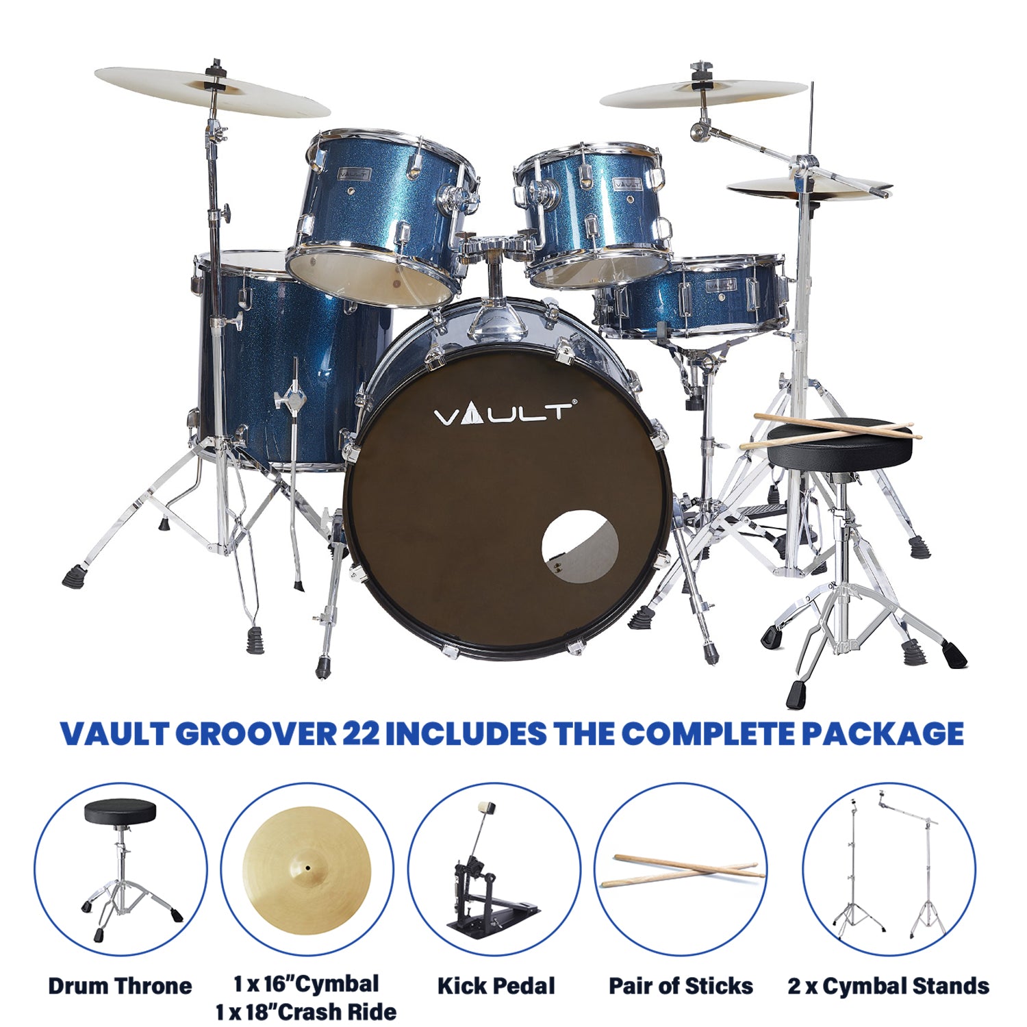 Complete with hardware, cymbals, and a comfortable throne, the Vault Groover package offers everything needed to start playing immediately. This kit combines quality, value, and performance—perfect for drummers ready to elevate their rhythm.