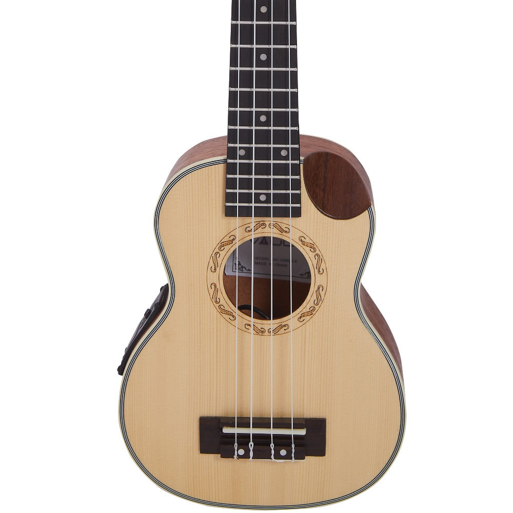 Vault UK-1000SC 21-Inch Solid Spruce Top Premium Semi Cutaway Soprano Ukulele Vault is back with its new & upgraded - Solid Top Ukuleles; made from some of the finest natural woods, high performance components & delivering unmatched sound. Solid Spruce Top The Vault UK-1000SC is a 21-Inch Solid Spruce Top - Soprano Ukulele , with Mahogany laminate back and sides. Solid wood-top ukuleles have a distinct advantage over laminate or ply tops in the quality of resonance that they provide. This is the perfect ukulele for any learning to advanced musician and is lightweight, comfortable & compact.