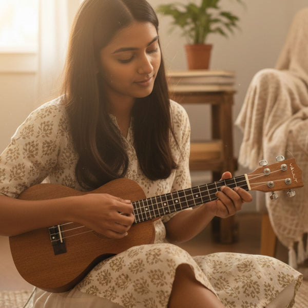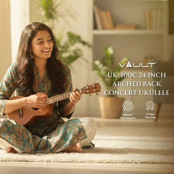 Vault UK-100 is a 24 inch Concert Ukulele With Gig Bag. It has a sturdy construction and is portable and easy to use outdoors. Mahogany Laminate Neck, Sapele Back and Sides with a Techwood Fretboard create rich, clean and warm tones. Add the high quality strings and you get the Vault UK-100 Concert Ukulele, which is the best concert option for beginners and professionals alike.