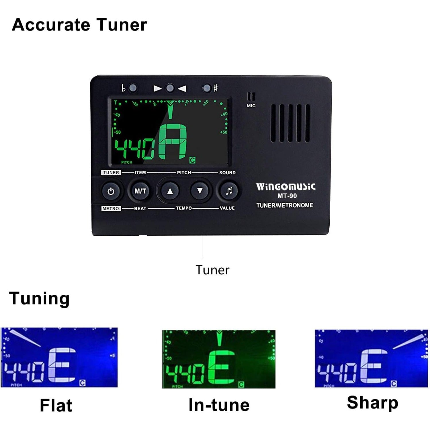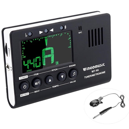 Wingo MT-90 Metro Tuner Overview: Tuning mode: Chromatic, Guitar, Bass,Ukulele A4 Calibration: 440Hz Display: Change color when in tune Metronome & Tone Generator Function with pick up