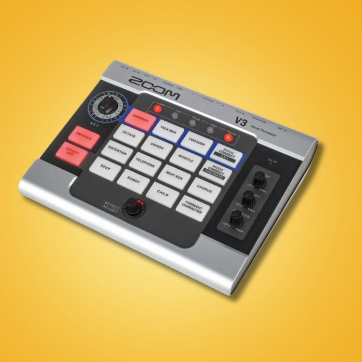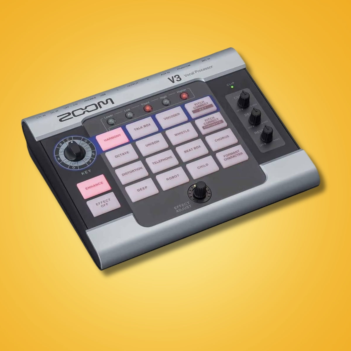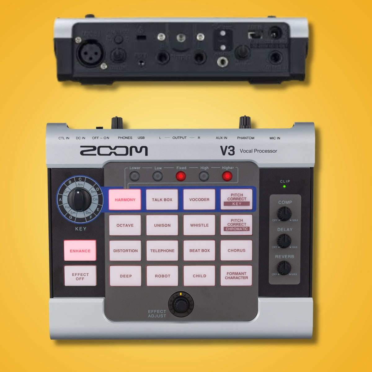 Zoom V3 Vocal Processor Overview: Whether you’re streaming, recording, or collaborating online, the V3 is packed with effects, harmonizing options, pitch correction and more. Your voice will sound amazing - from home, or anywhere else. BACK YOURSELF UP Create and arrange your own backup vocals. Add up to two voices to create your 3-part harmonies in both major and minor keys.