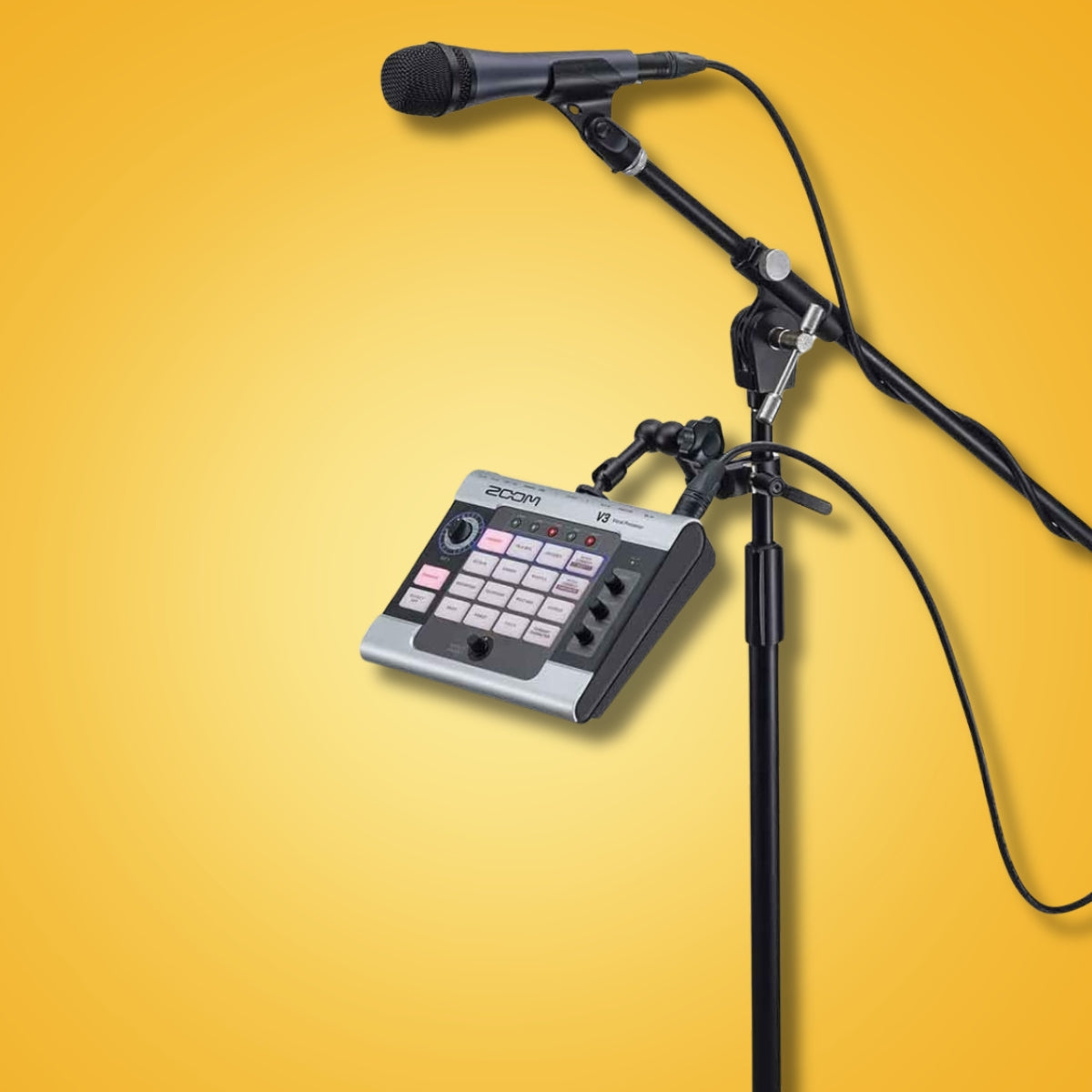 HANDS-FREE CONTROL Toggle effects precisely on beat with the ZOOM FS01 footswitch, or freely modulate effect parameters with the ZOOM FP02M expression pedal. EASY ACCESS The V3 can be used on a tabletop or can be attached to a mic stand using the Zoom HRM-7 (7 inch) or HRM-11 (11inch) Handy Recorder Mount.